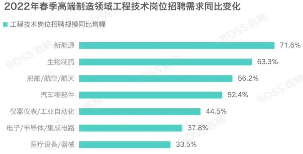 而正如爱丽丝、李生提到的,硬科技方向如今成为热门招聘领域。《观察》指出,春招旺季以来, 新能源、航空航天、集成电路、医疗器械、生物制药、 工业自动化等高端制造业领域的招聘规模出现快速增长,同比增幅超过40%,突出地表现在工程专业技术岗位上。