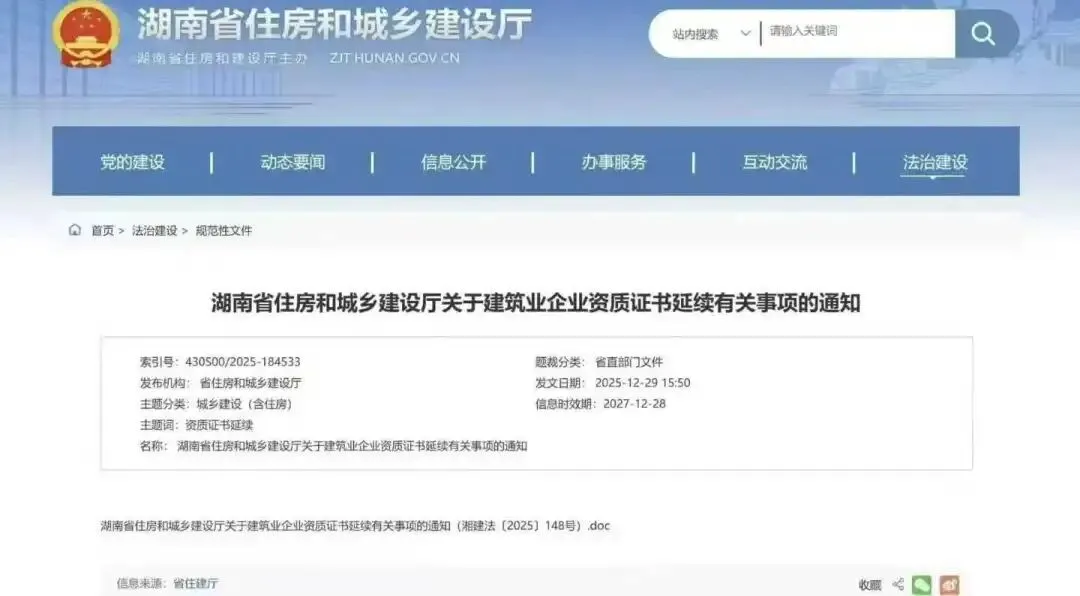 近日,湖南省住房和城乡建设厅发布了一项关于建筑业企业资质延续的通知,其中一项核心调整迅速引发行业高度关注:企业申请施工总承包、专业承包二级资质延续时,主要人员需满足相应类别二级资质标准要求,不再按最低等级进行匹配。 此前,全国大多数省份的建筑企业在办理二级资质延期业务时,普遍采用的是相对宽松的标准——除了技术负责人和企业净资产要达标二级资质标准之外,主要人员(建造师、职称、技术工人)的配置只需要满足对应类别的三级资质标准就可以。甚至一些地区只审核建造师和技术负责人,职称和技术工人都是承诺制,直接填个人员表格就可以。按建筑总承包二级和三级为例,人员差多少,成本需增加多少当前建筑业低迷期正是住建部门以 “不破不立” 推进优胜劣汰的关键窗口期,核心策略是 “精准出清、留强扶优”,通过资质动态核查、信用分级监管、质量安全硬约束与政策倾斜,淘汰僵尸 / 低效 / 失信企业,稳住绝大多数合规与优质企业。形势再转变,建筑业资质延续收紧,不要被时代洪流吞没了。近年在公众号{福建建筑资质}分享及解读建筑政策和见解,找人员、资质可以咨询,我们竭力为企业保驾护航