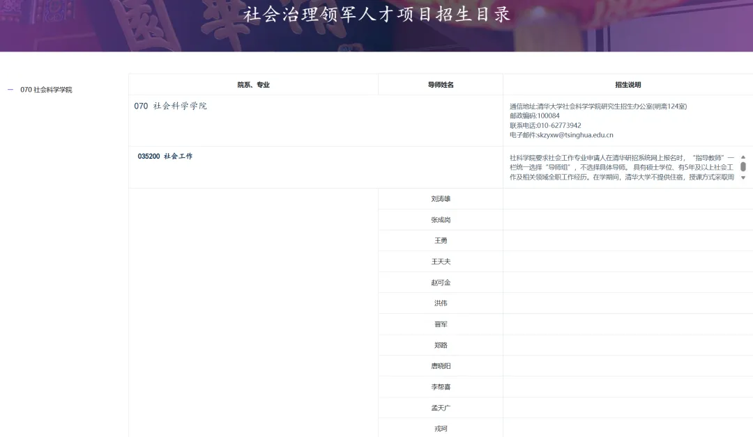 为服务中国社会治理现代化的发展战略,构建社会治理高端人才培养的新格局,清华大学于2024年首次开设社会工作专业博士学位“社会治理领军人才”项目。项目将利用清华大学雄厚的社会科学和工程教育的基础,充分发挥社会科学学院多学科交叉融合的优势,培养兼具社科素养和科技背景的社会治理领军人才。