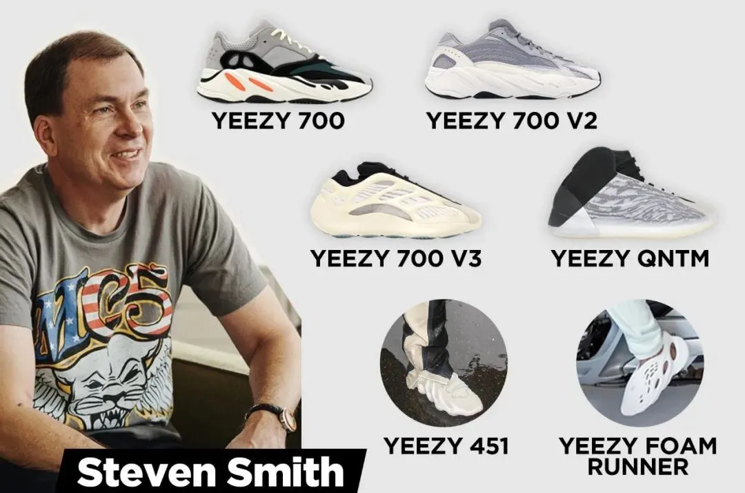 离开 New Balance 后,Steven Smith 辗转东西海岸,在世界各大知名运动品牌担任高管,adidas 高级设计师、Reebok 创新设计总监、Fila 创新经理、Nike 女性产品设计经理 ... 头衔数不胜数;并带来了一系列经典产品,包括 Reebok InstaPump Fury、Nike Air Streak Spectrum Plus、Nike Air Max 2009 等等。如今 Steven Smith 已经是业内公认最有经验的球鞋设计师之一。2016 年应侃爷的邀约,Steven Smith 出任 YEEZY 执行设计总监,设计的第一款球鞋就是 YEEZY 700。结果朋友们都知道了,YEEZY 700 引领了 2017 - 2018 年的复古老爹鞋风潮,之后也顺势推出了 V2、V3。目前已知 Steven Smith 负责的项目还包括 YEEZY QNTM、YEEZY 451、YEEZY 藻类环保鞋款的开发等等。近期 Steven Smith 接受 Complex 的采访,袒露在其他品牌工作就像一颗螺丝钉,而 YEEZY 是他经历过最有创造力的公司,侃爷给了他最大的自由度,任何想法都有实现的可能!
