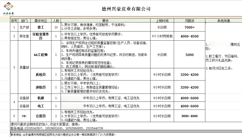 德州兴豪皮业有限公司现招聘