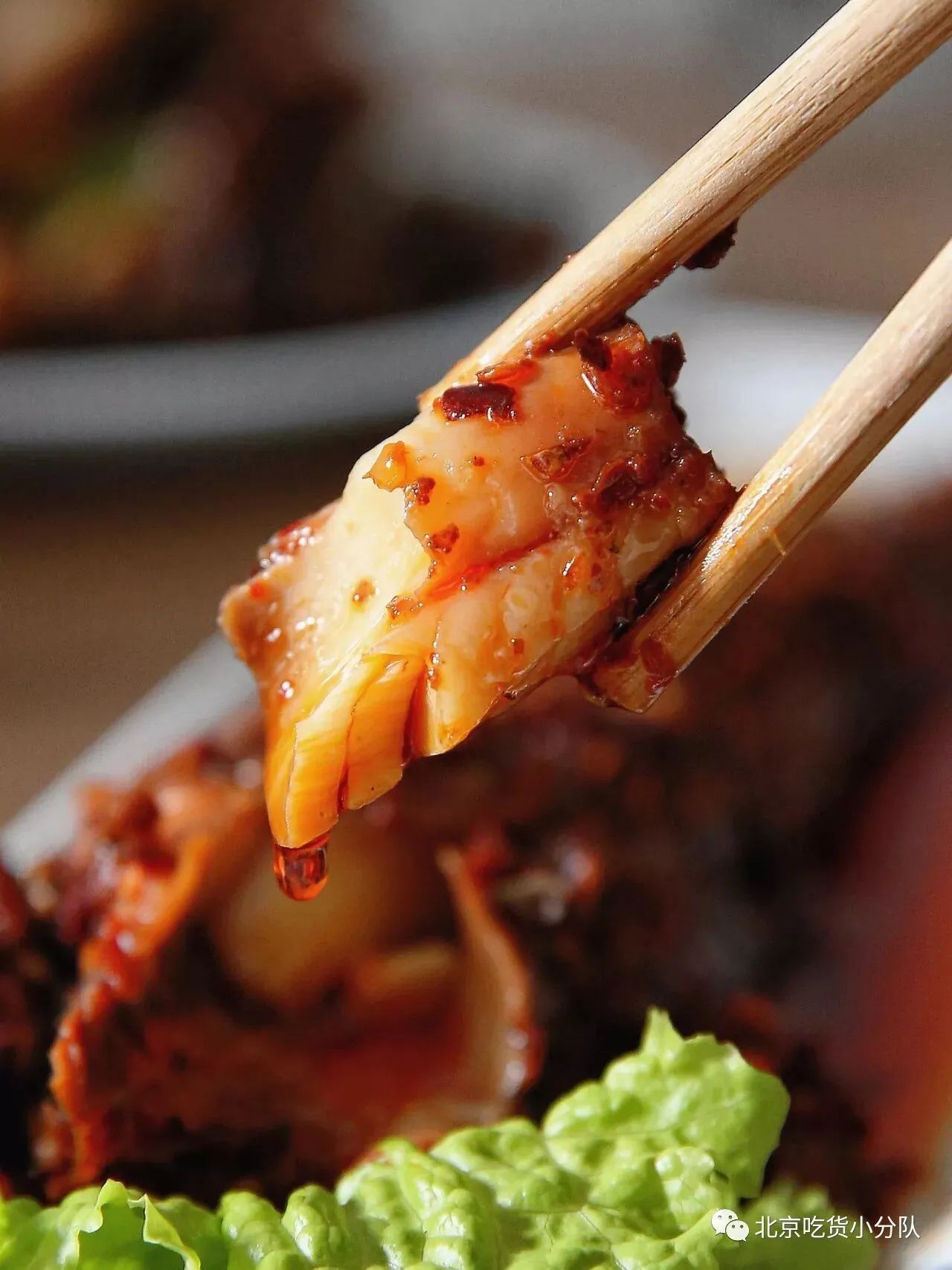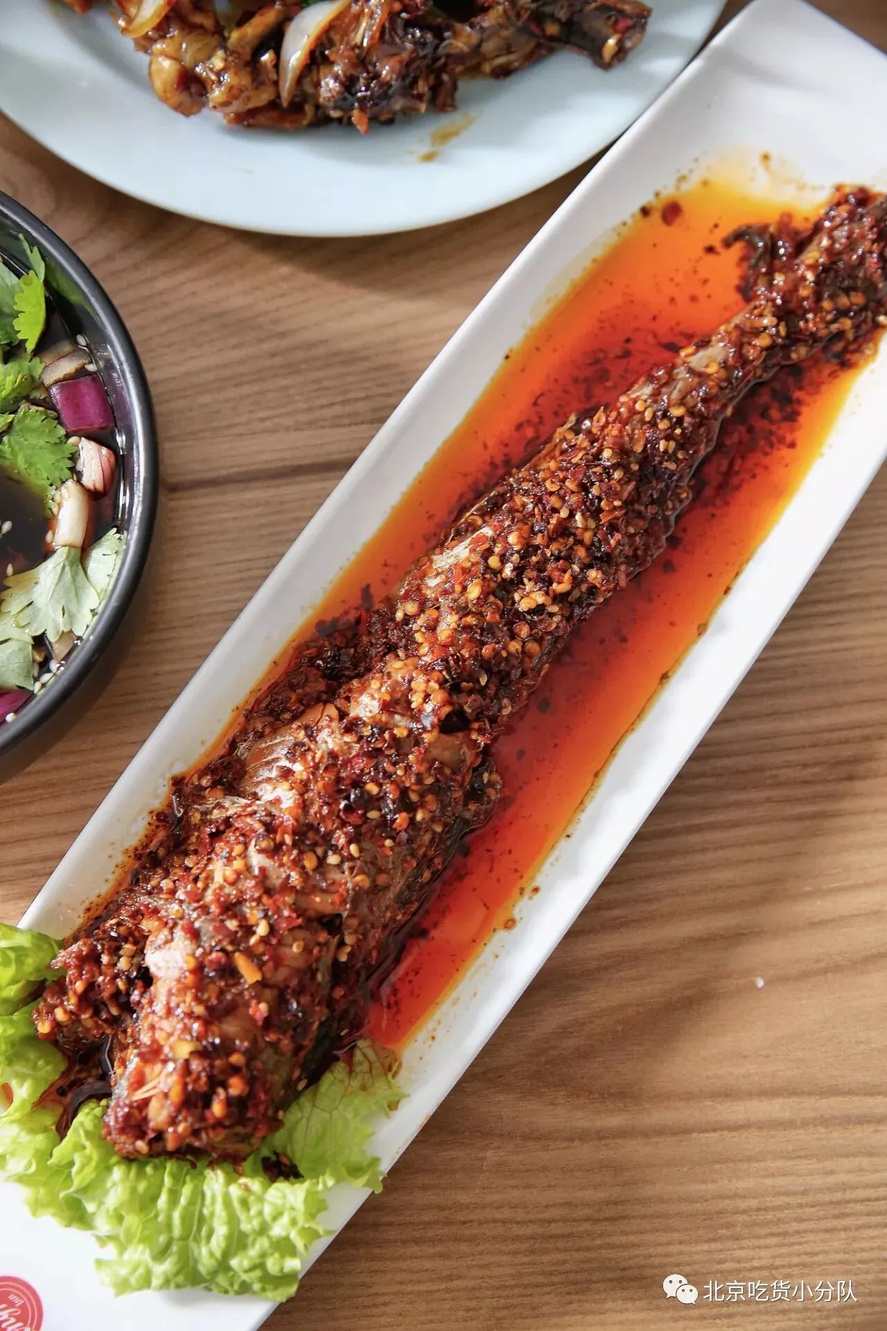 盖满辣椒的【小馆辣鱼】在抚顺当地就叫“辣鱼”,随便一个冷面馆都能点这道菜。去头的鳕鱼先蒸熟,再在特调的辣酱里泡4-6小时。