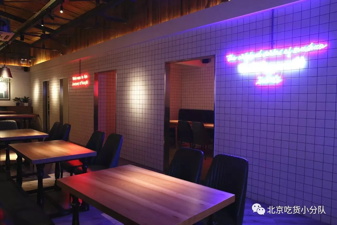 霓虹灯映照着白砖墙,复古bar风装修,简约中带着轻快的时尚气息。配上店里放的爵士乐,给人一种微醺感。