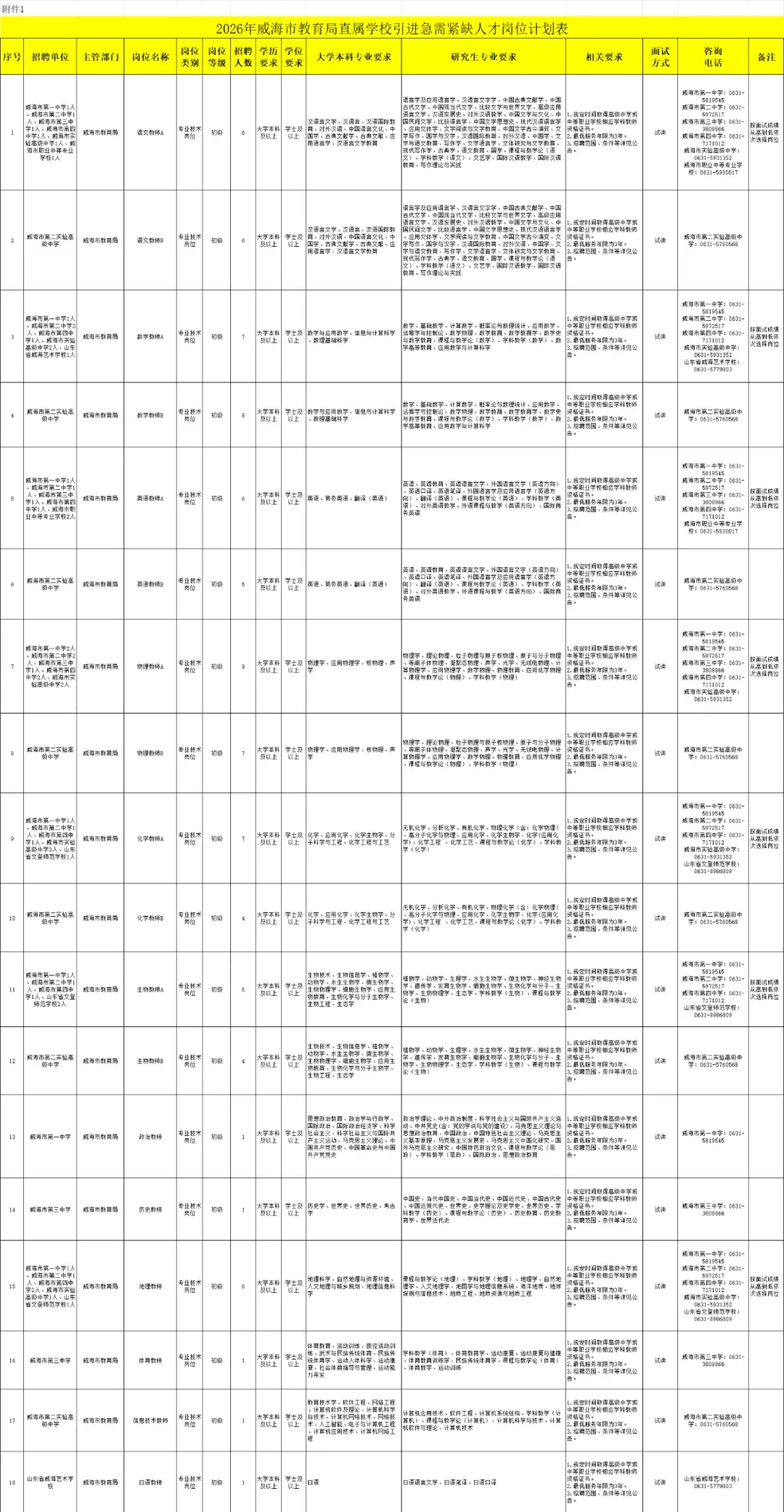 本次威海市教育局直属学校引进急需紧缺人才岗位计划及具体条件详见《2026年威海市教育局直属学校引进急需紧缺人才岗位计划表》(附件1)。