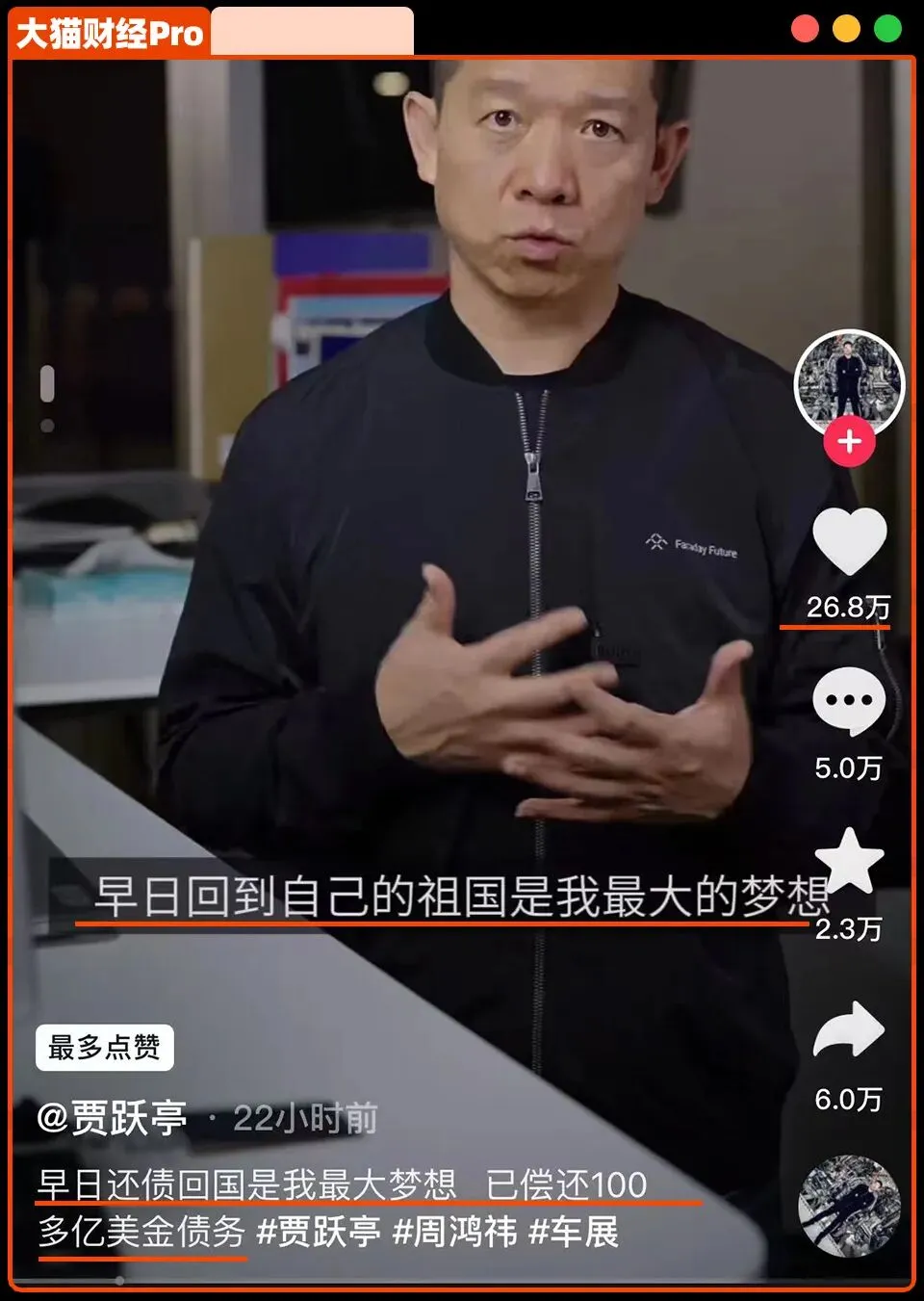 但贾跃亭搞钱行,搞业务真不行,折腾了好几年,这个车始终就搞不出来,但他在美国混,美国债主逼得紧啊。