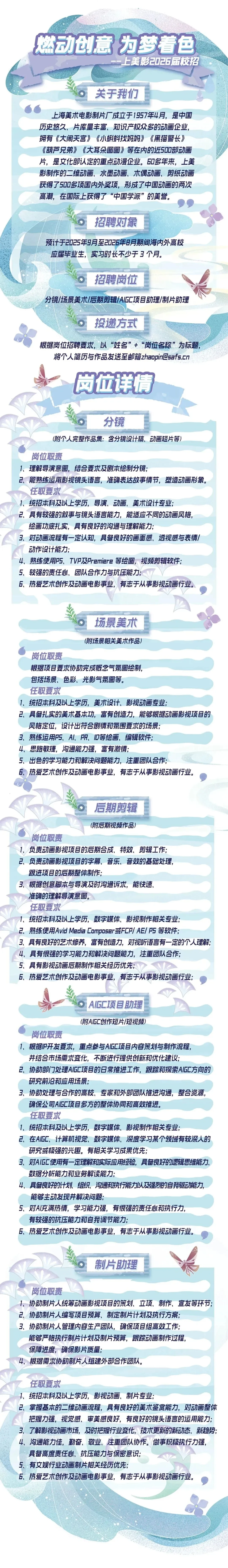 除「制片助理」外,所有岗位需附上个人完整作品集