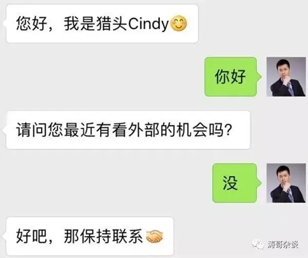在初次沟通时,候选人表示对目前的状态很满意,不考虑外部机会,而Z明白在没有建立信任的情况下很难让人选敞开心扉,因此先加了对方微信每天聊一两句。