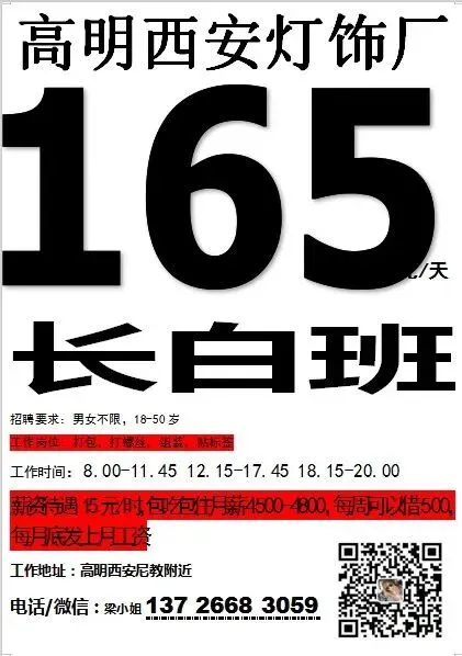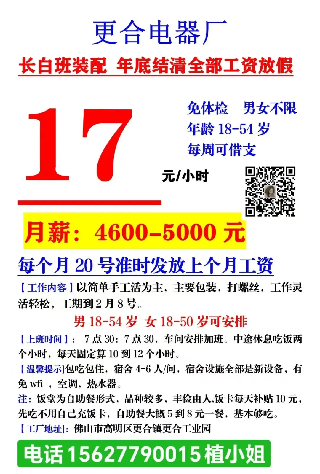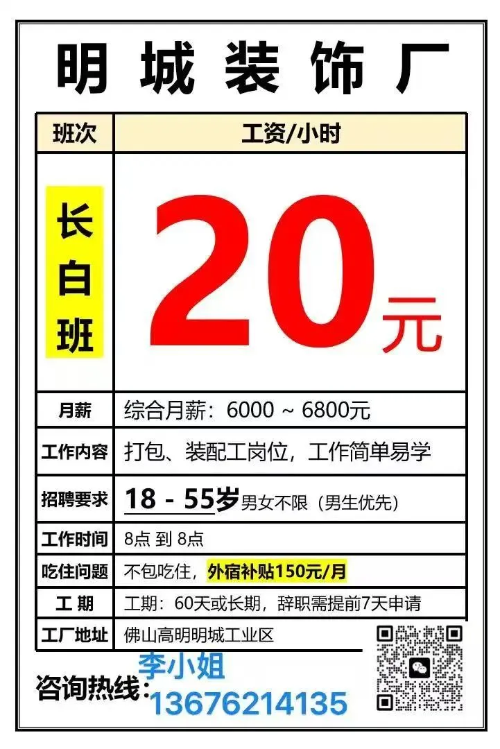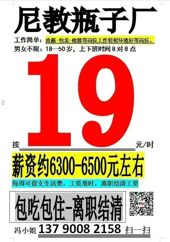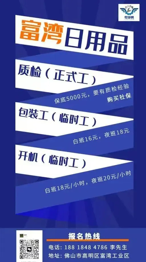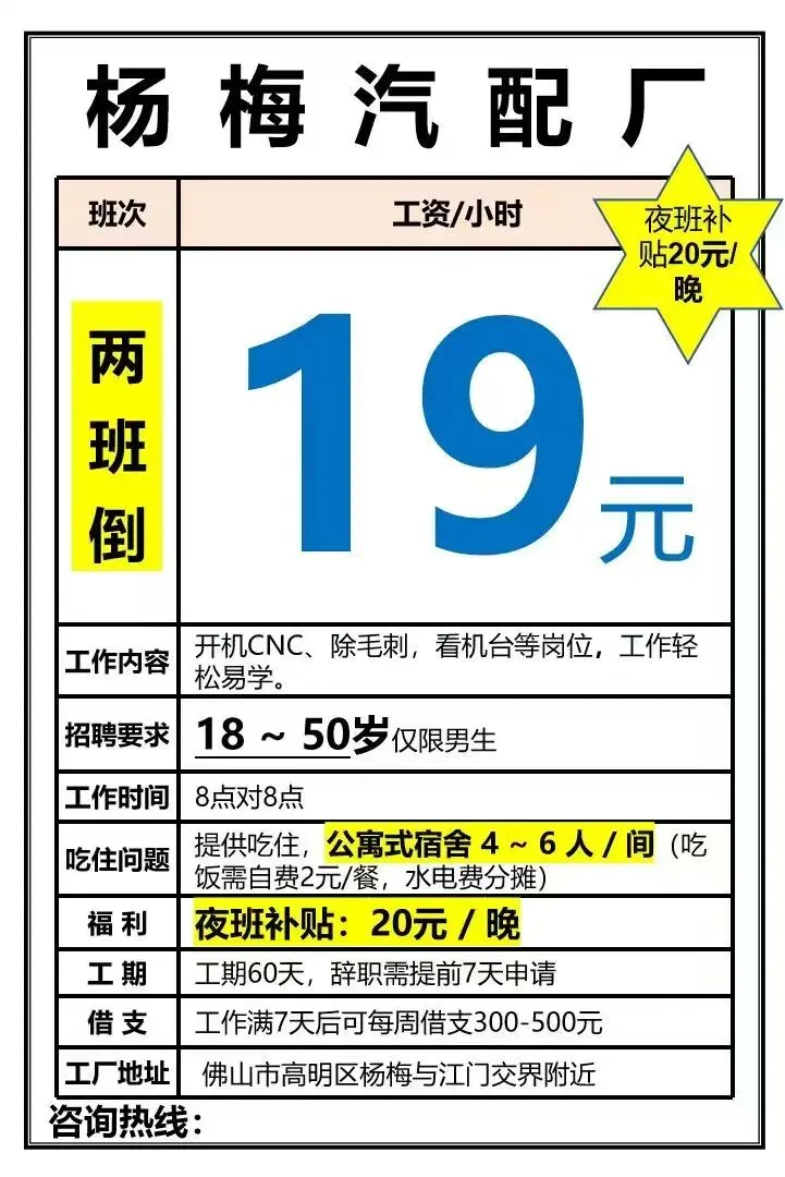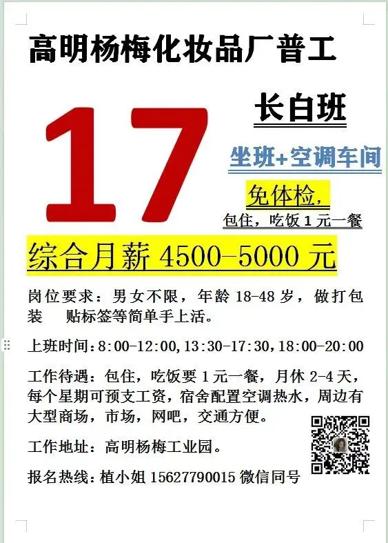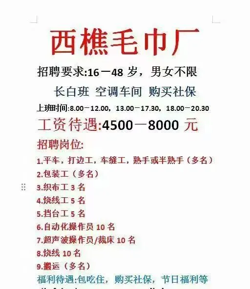 福利:所有岗位均包吃包住(需分摊水电费),购买社保,宿舍有空调、无线WIFI、热水器,工资准时发放