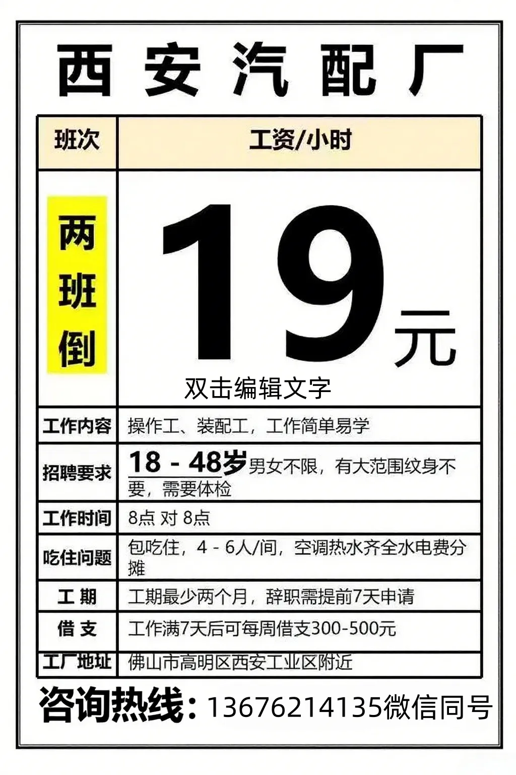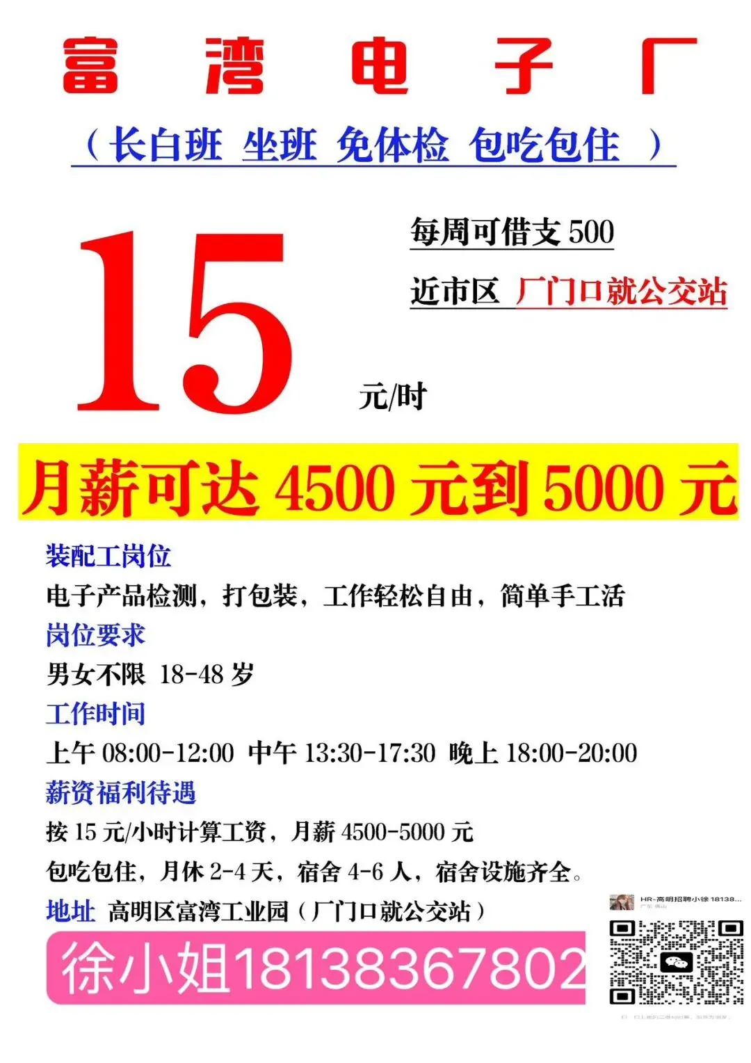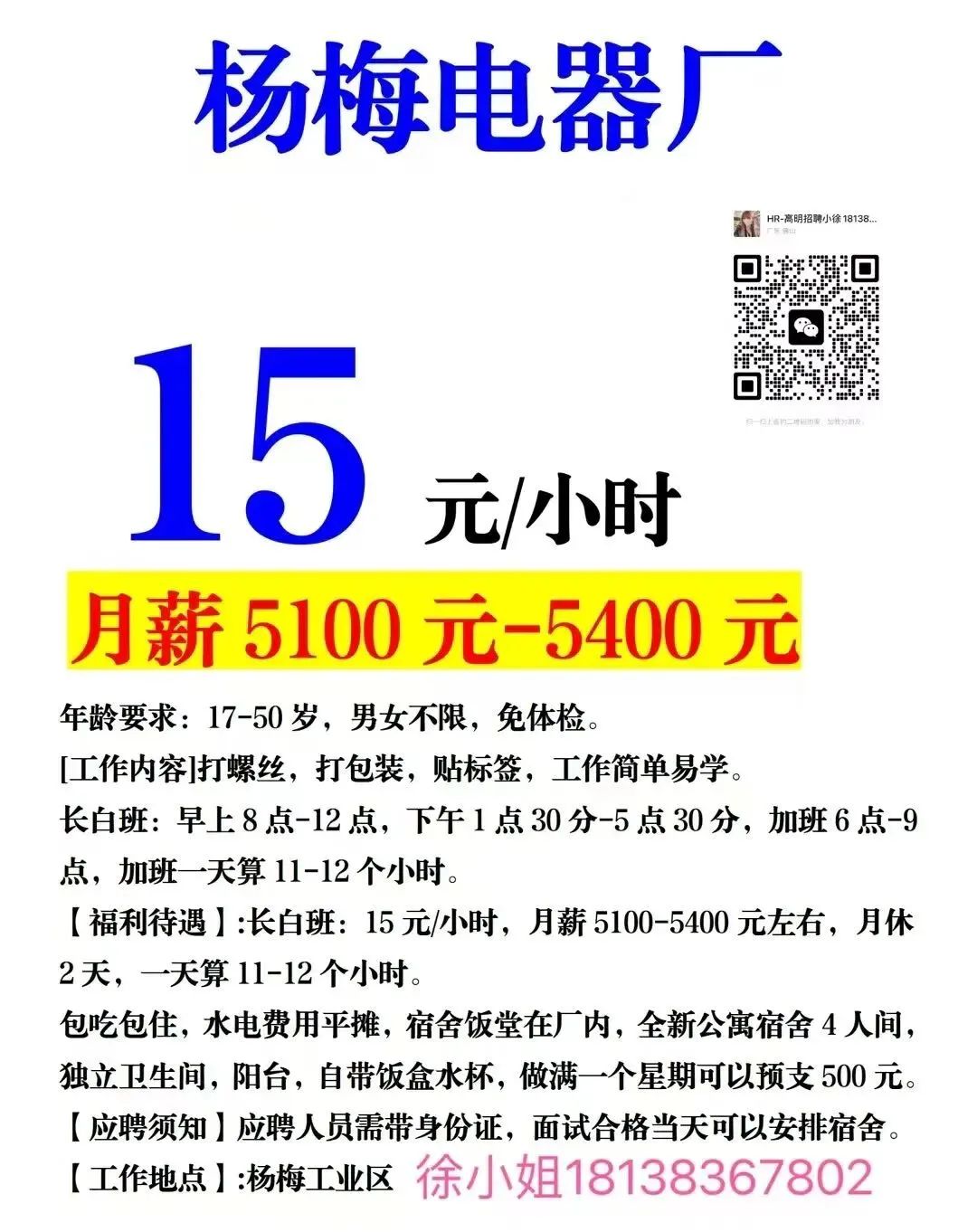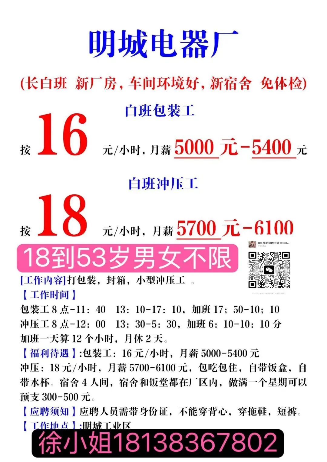 福利:所有岗位均包吃包住(需分摊水电费),购买社保,宿舍有空调、无线WIFI、热水器,工资准时发放