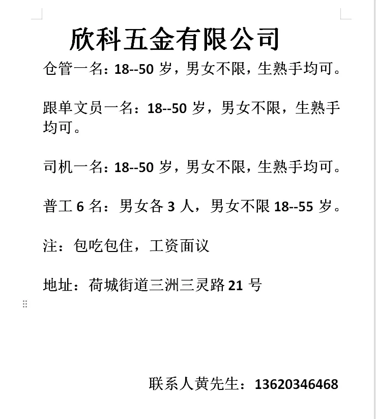 岗位要求:懂得沟通配合工作,服从工作安排