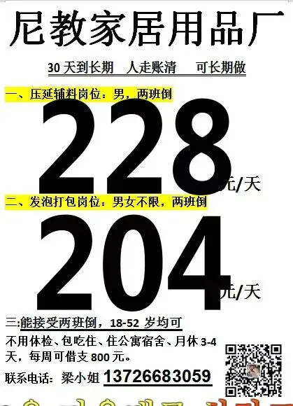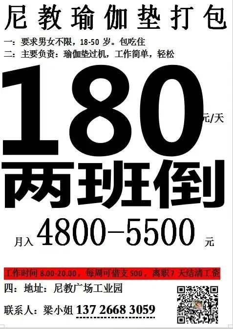 岗位要求:服从工作安排;两班倒,月休两天(不休补两天工资,半年后可调薪)