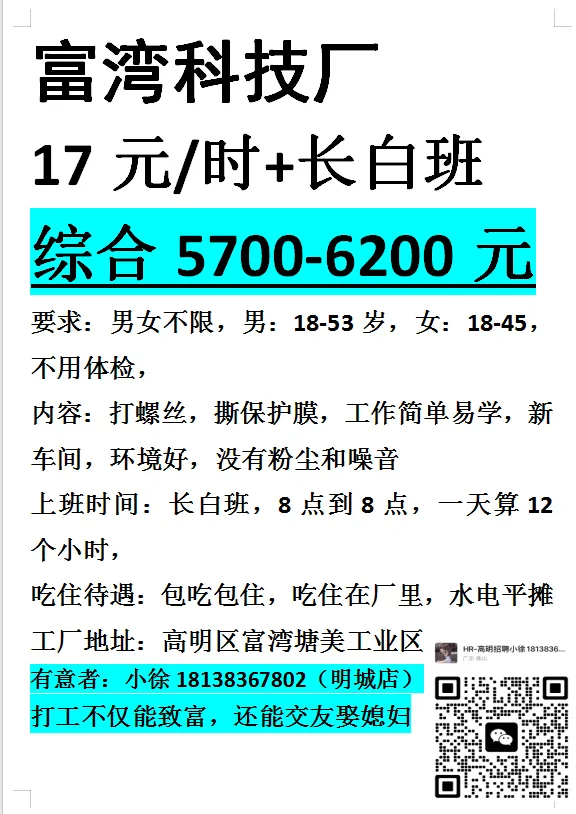 岗位要求:做事认真负责,学习能力强,服从工作安排,能接受两班倒