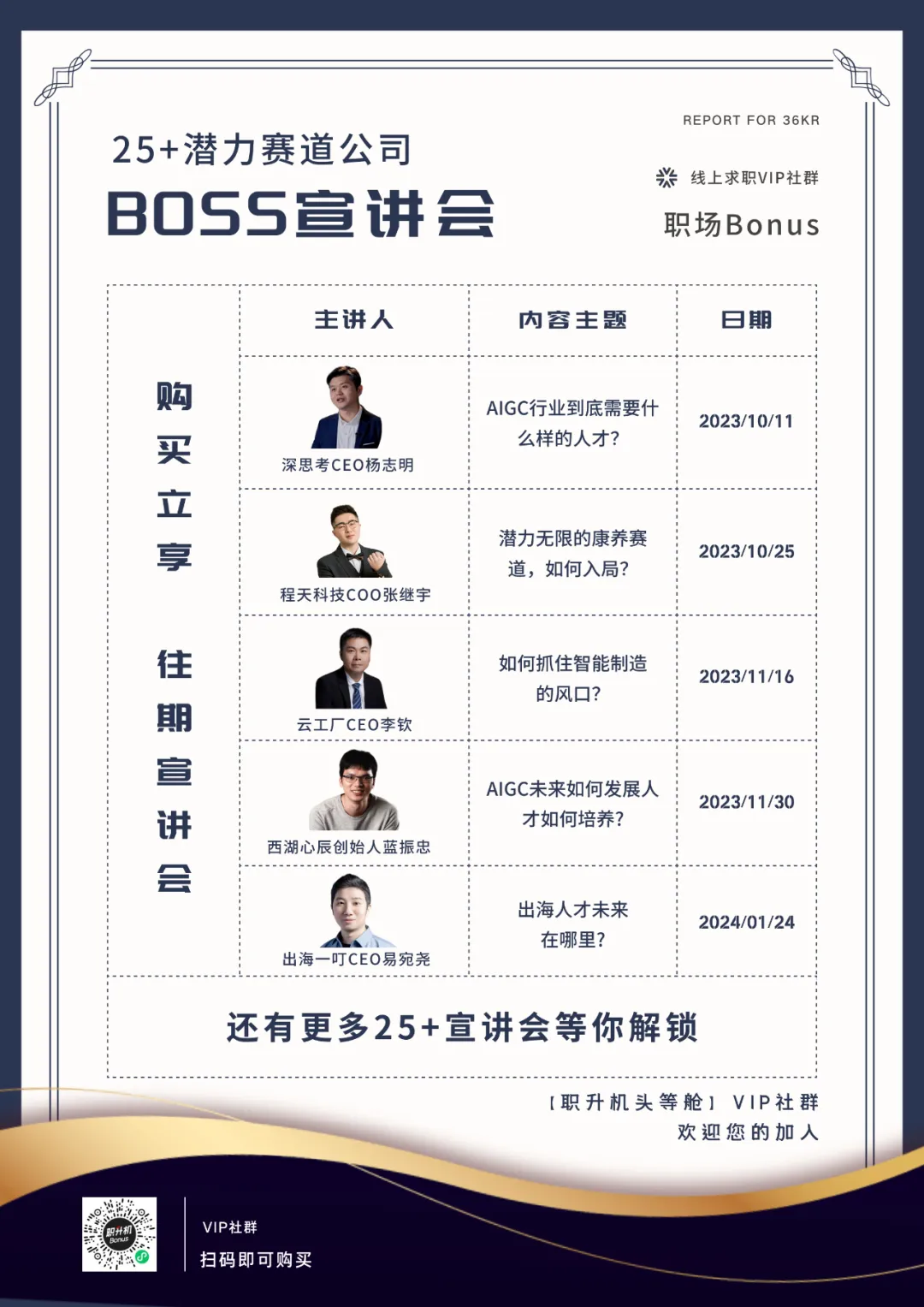 36氪职场Bonus联合20年资深高管猎头——张美吉及其团队,共创【职升机·内推尊享】服务。顶级人才专家团,三个月内,为你内推红利公司,斩获心仪offer。