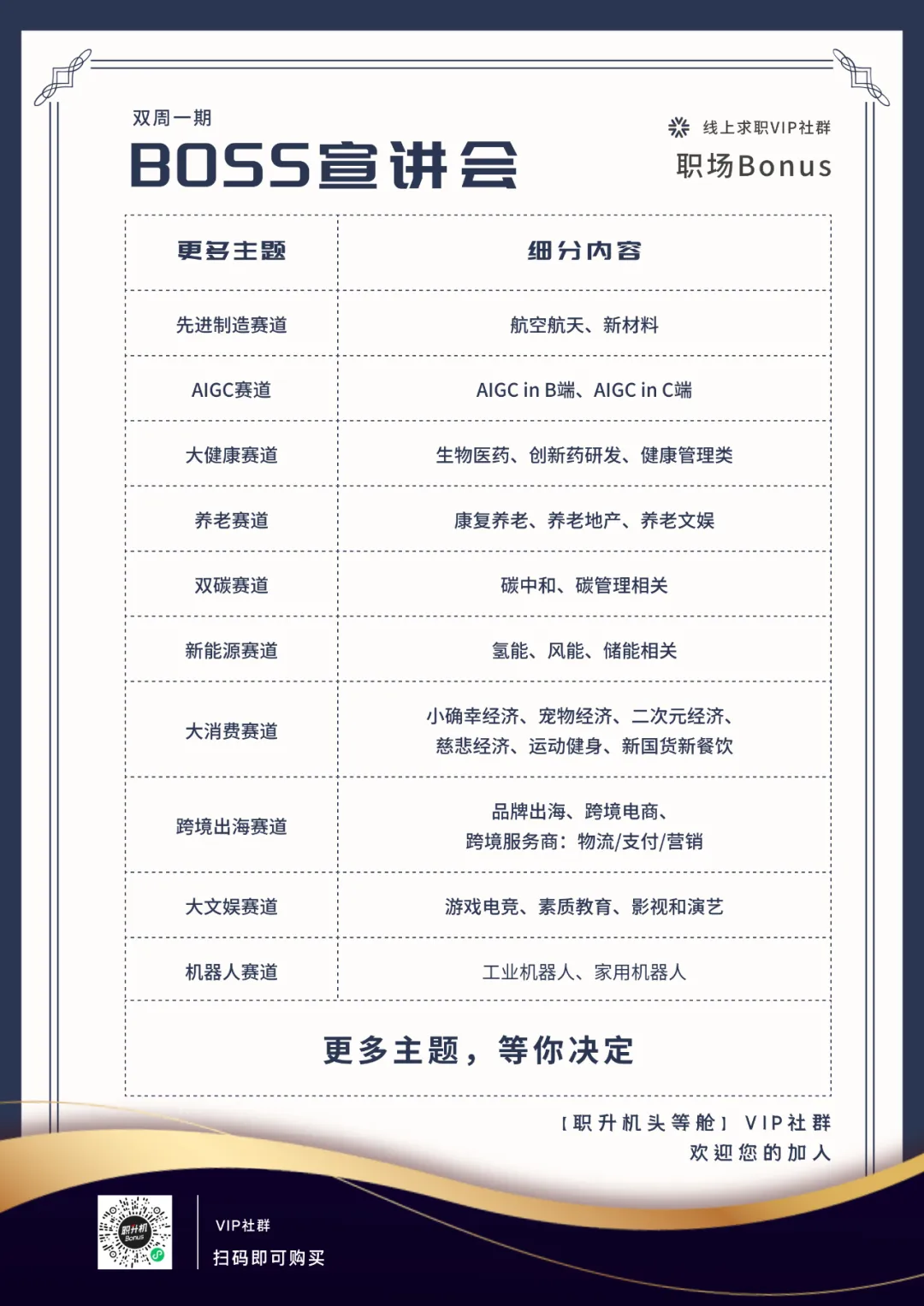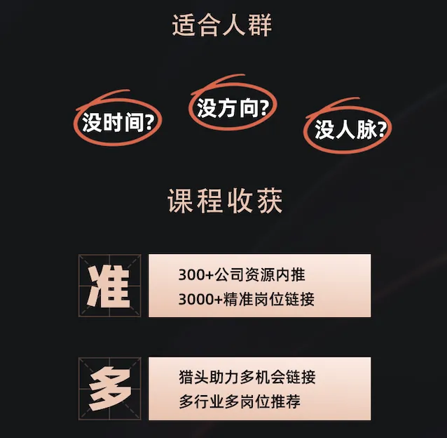 如果你现在深陷职场内卷,身心俱疲,考虑更换赛道; 如果你已经起心动念,正闭门研究宏观趋势、国家政策、行业前景; 如果你已经摸清行业,但依然没有能力去识别真正的红利公司; 如果你已经选中了心仪公司,却苦于没有人脉内推……