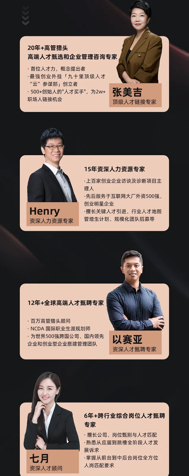 你将获得4位人力专家团队+身后100+猎头的全心服务,从机会对接到面试谈薪,帮助你更高效更精准地拿到好机会,实现人生的弯道超车。