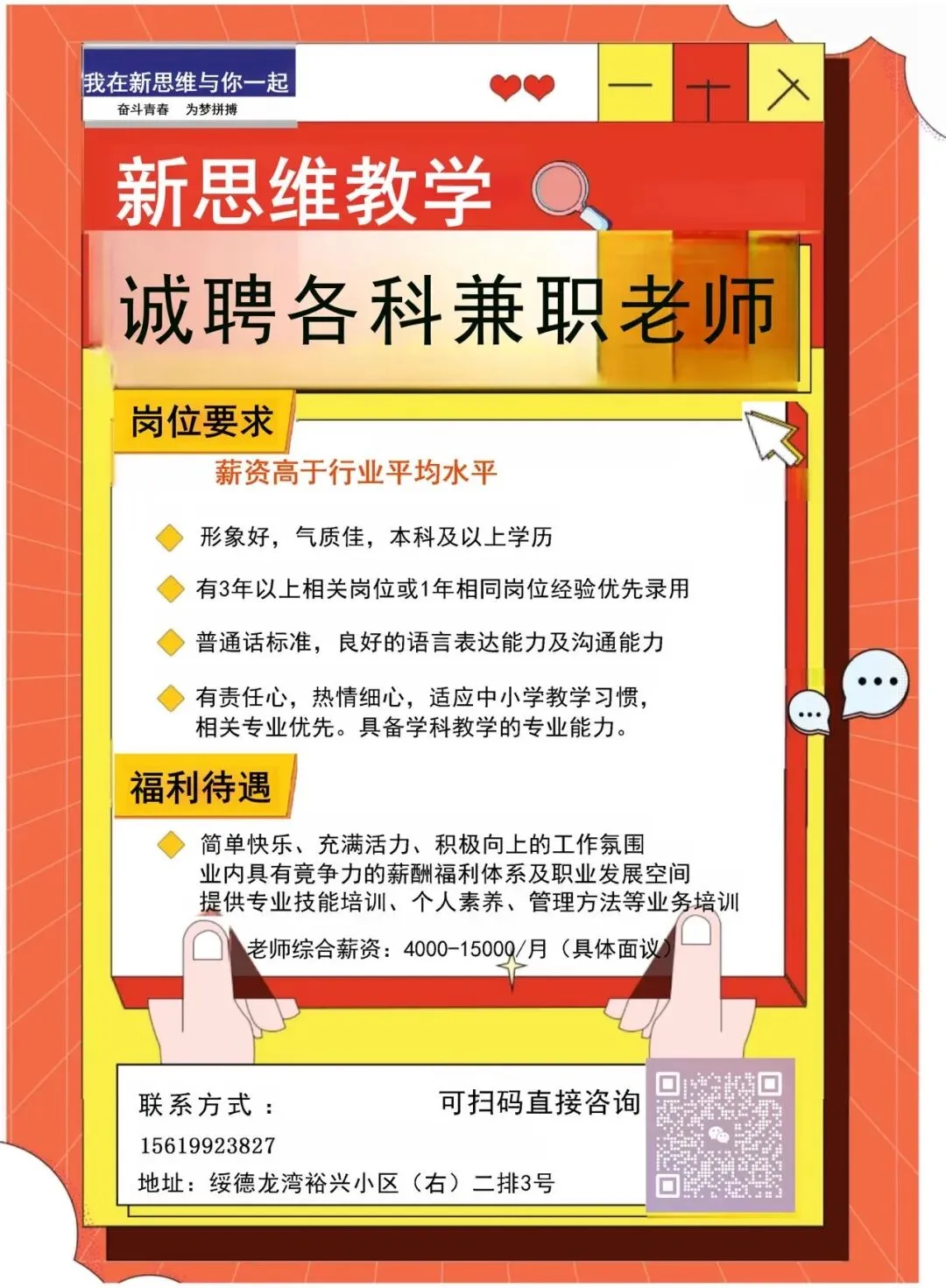 绥德新思维自习室招聘高中和初中各科老师,待遇优厚。要求认真负责,专业知识强硬,有经验者优先。
