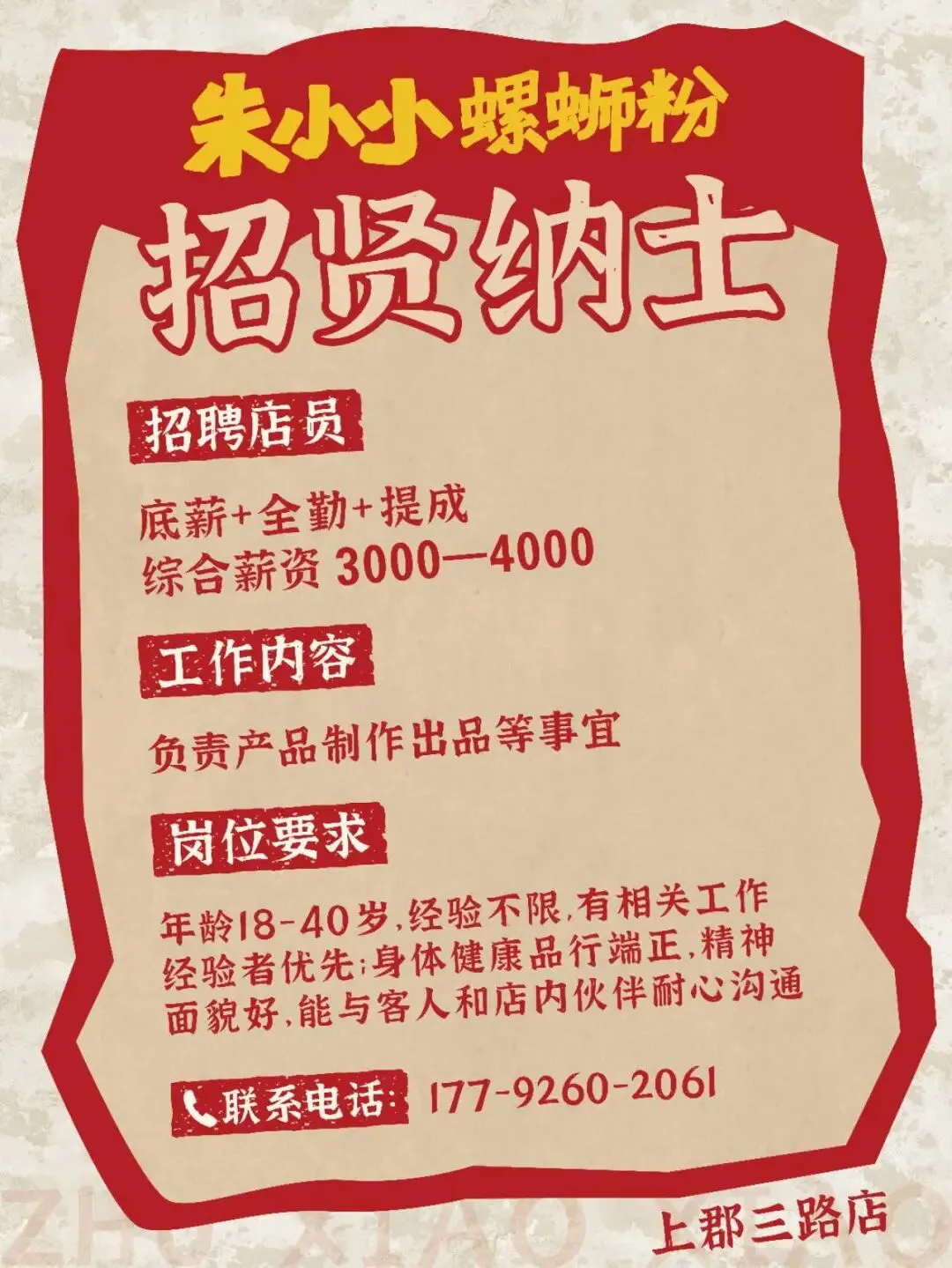 绥德金阳光朱小小螺蛳粉店诚聘长期工: 餐厅员工:年龄18~45岁,上班时间10小时,一月2天公休 工资待遇:3000-4000 岗位要求:良好的口头表达能力,吃苦耐劳,能承受较大的工作压力。