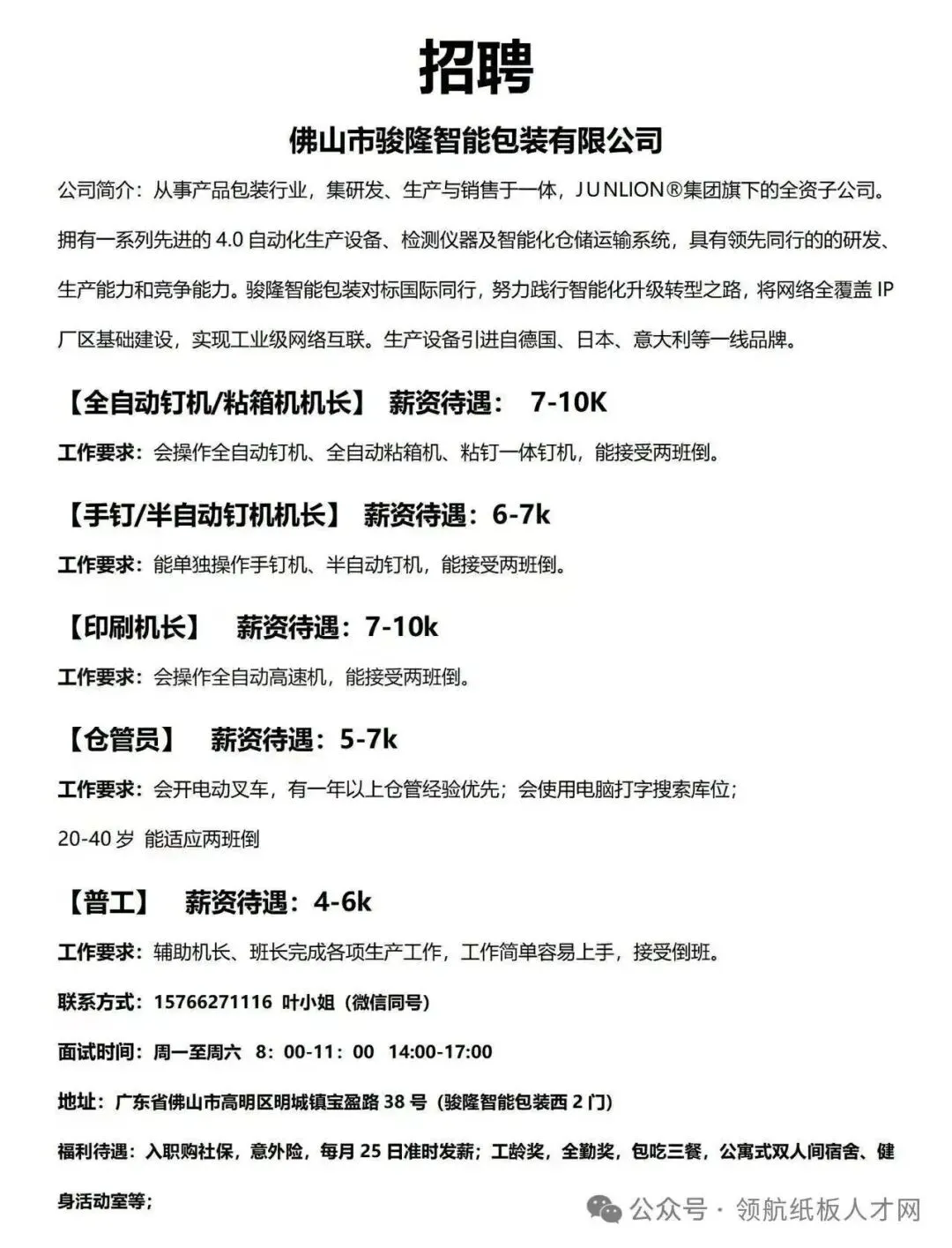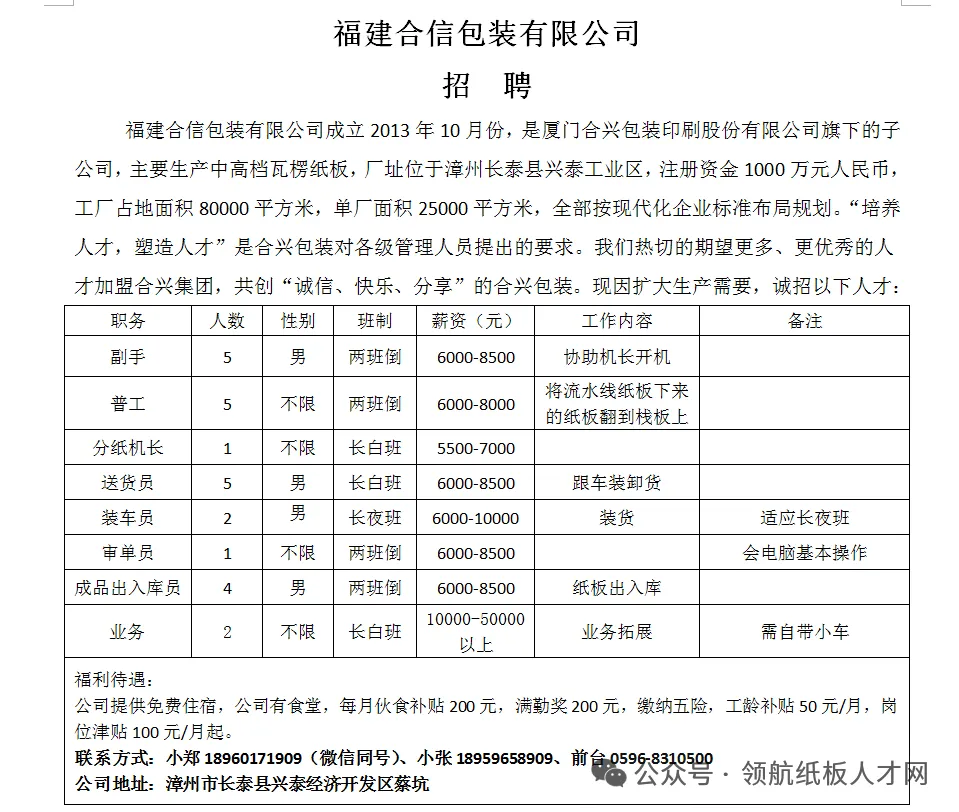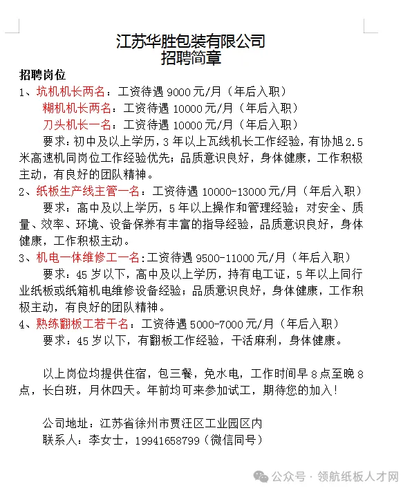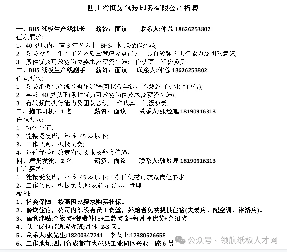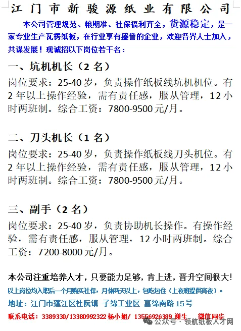 招聘:水印机长、纸箱后道总机长(要熟练自动粘箱机)、纸板线主管
