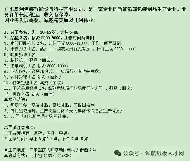 招聘:模切机机长、裱纸机长(学徒)、覆膜机长(学徒)、糊箱机、罗兰700印刷机长、粘合打钉工