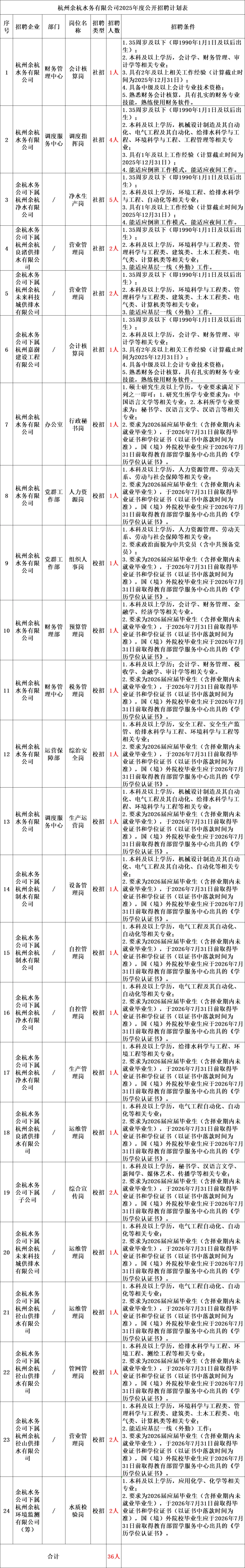附件:《杭州余杭水务有限公司2025年度公开招聘计划表》