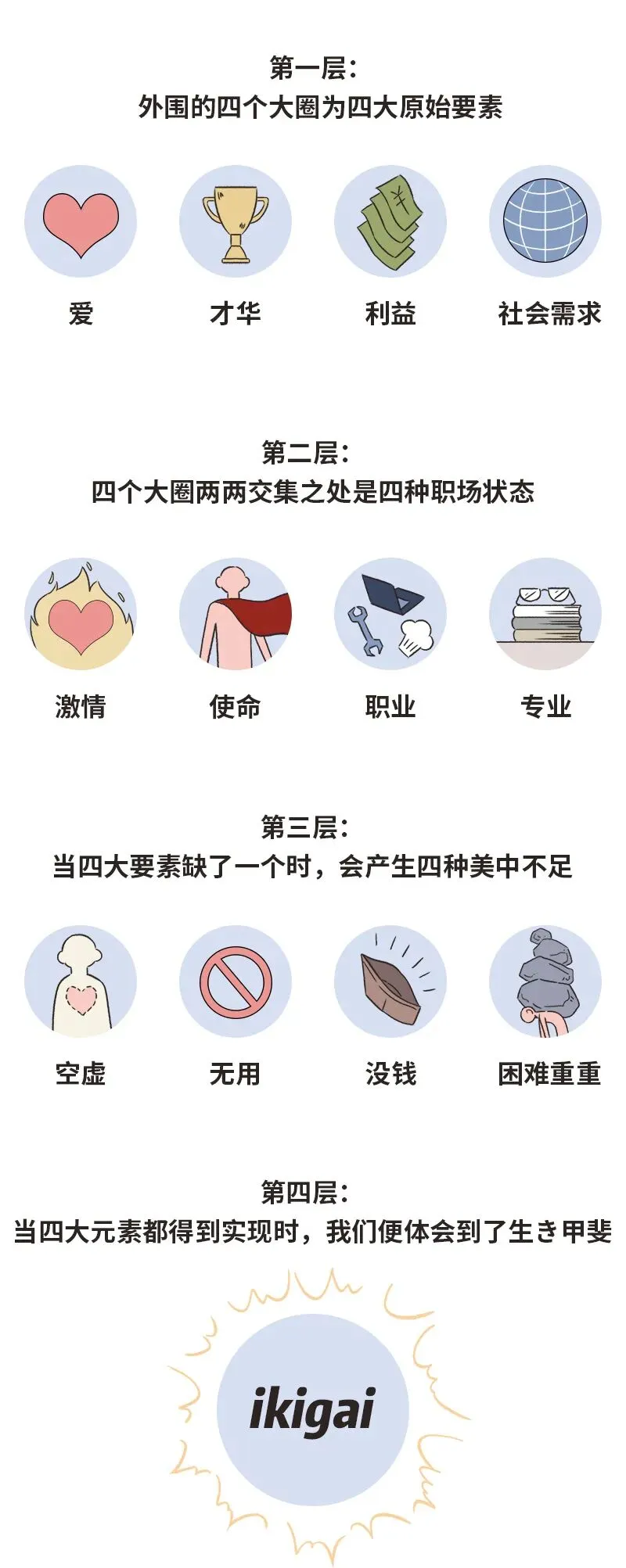 回答完这些问题以后,如果你能在四个原始因素中找到一个共存的点,那么恭喜你!这就是你的“生き甲斐”!