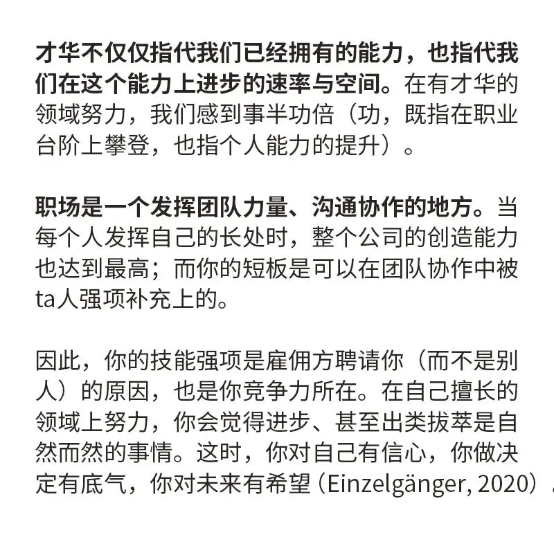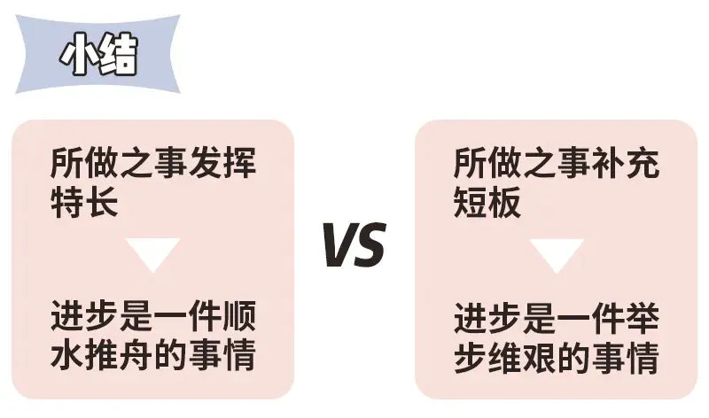 在短板上努力,我们每一次的进步都要花费九牛二虎之力,又累,回报率又低。此时我们会有危机感和不确定感,总觉得自己要努力十倍才能和隔壁桌老王旗鼓相当,甚至还会担忧,万一别人再努力一点,自己的价值会不会就不存在了。
