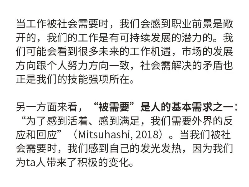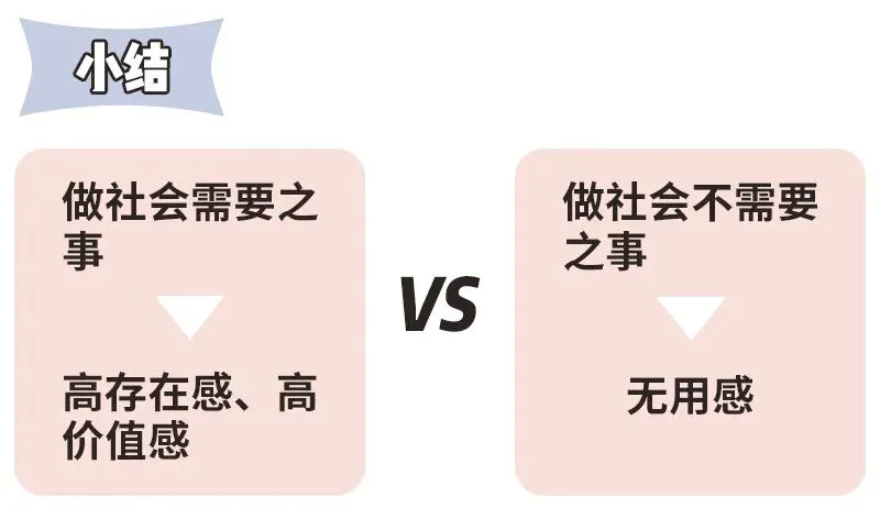相反,当我们的付出不被社会需要,或我们不认同自己工作的价值时,我们很容易因为外界的负面评价而感到动摇。这是因为,我们在内心深处感到自己的存在是可有可无的、无用的。