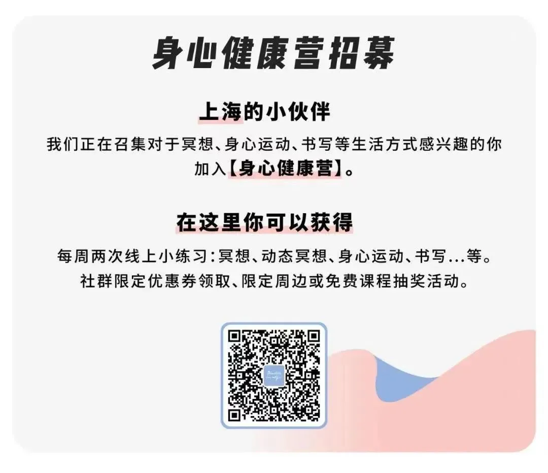 此外,还可以通过冥想、身心运动、书写练习等方式进行自我觉察,以此来开启“生き甲斐”。上海KYers的福利时间到!如果你对冥想、身心运动、书写等生活方式感兴趣,欢迎扫码加入我们的身心健康营,和大家一起练习吧~再者,随着职场经验的增加,以及个人的成长,“生き甲斐”也是会发生变化的。某项曾经能让我们每天从床上弹起来的工作,可能因为日渐熟悉、熟练而变得枯燥无味。因此,“生き甲斐”也是一个要求你的行动的动词,你总要在行动中不断实践,慢慢向它靠拢。