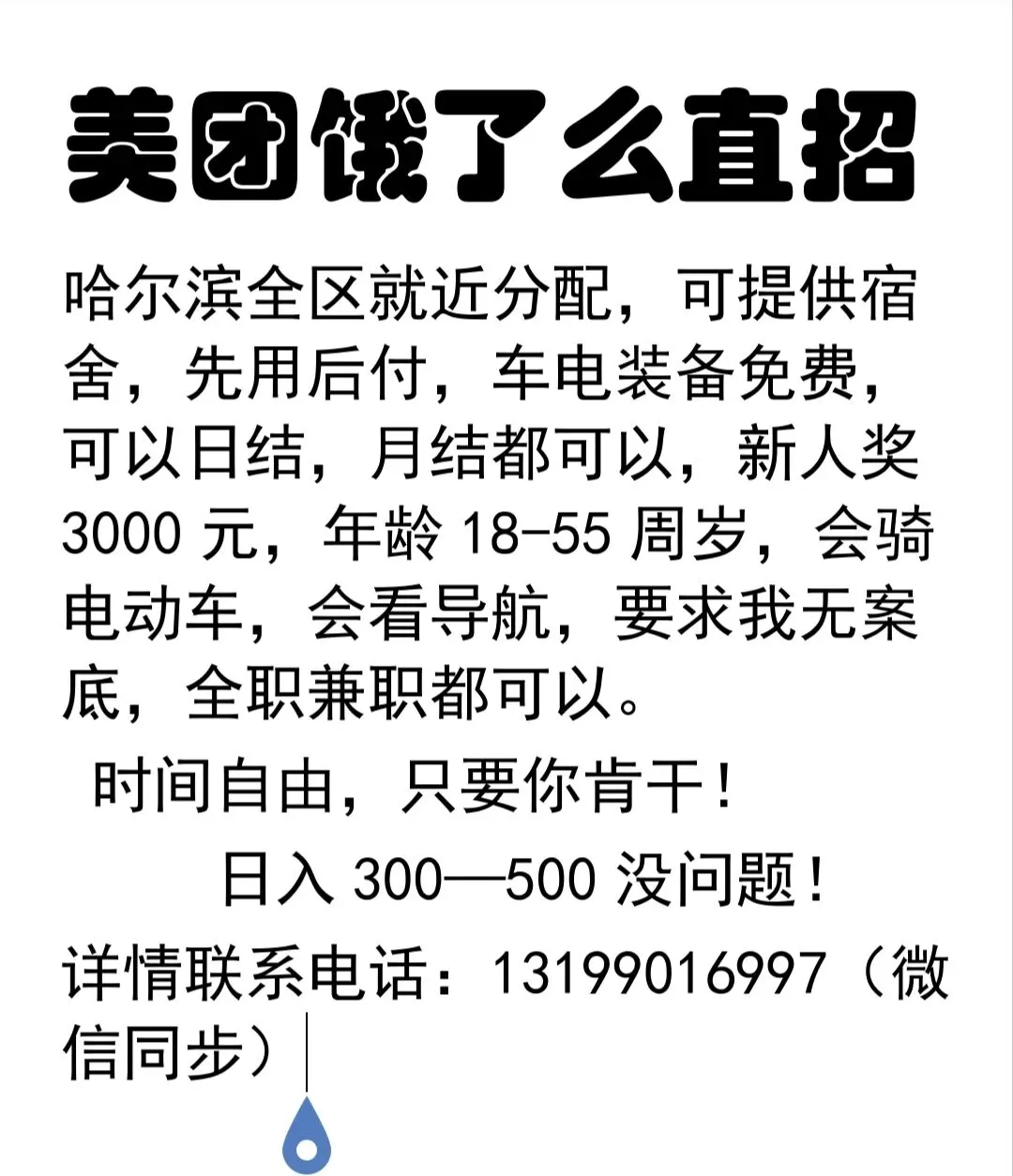 薪资待遇:结算灵活,日结,周结、月结均可,按单结算 ,平均每单7-9元 ,每天平均40-70单 ,多劳多得,看个人能力,薪资7000-12000/月不等,上不封顶,多种补贴,高温补贴,距离补贴,超重补贴,恶劣天气补贴等多项补贴,还有888-3500 元不等的高额新人入职奖励,公司提供电动车,装备,住宿,先用后付,前期没有任何费用;