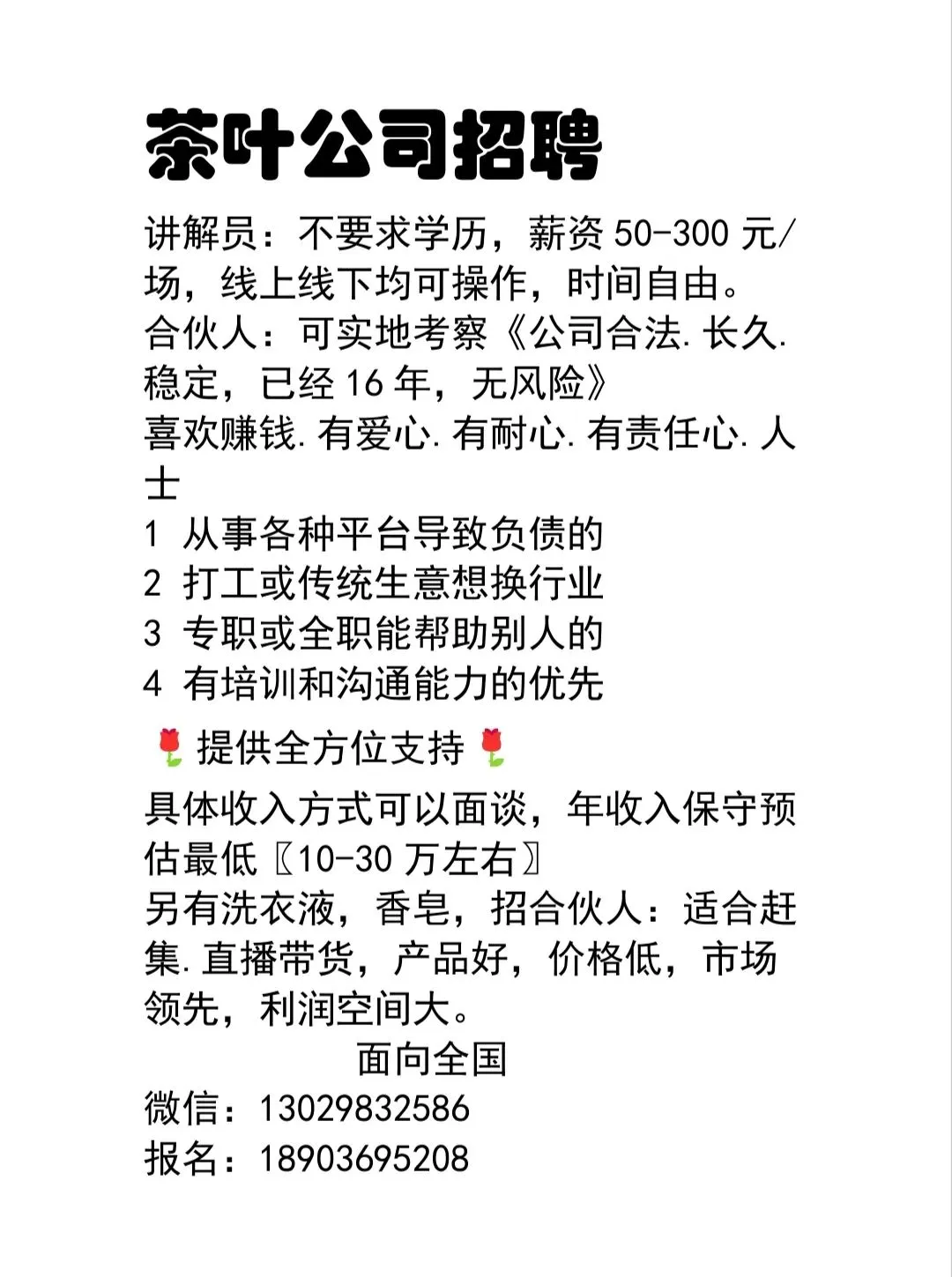 • 工作要求:无需对茶叶有过多了解(提供专业话术),每天工作时间2-3小时,单休