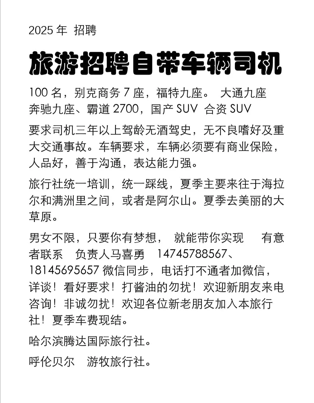 1⃣️工作内容简单,只要你有驾照自己带车入职无押金,无车公司可提供车辆,不看车型,活多事少,时间自由,上线即接单,下线即休息,可专职可兼职,无任何压力,自己时间自己做主。