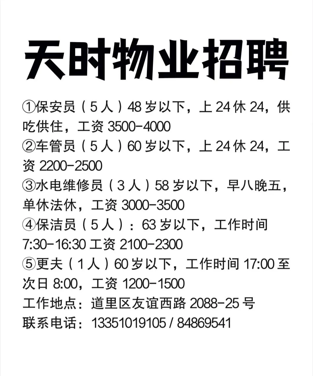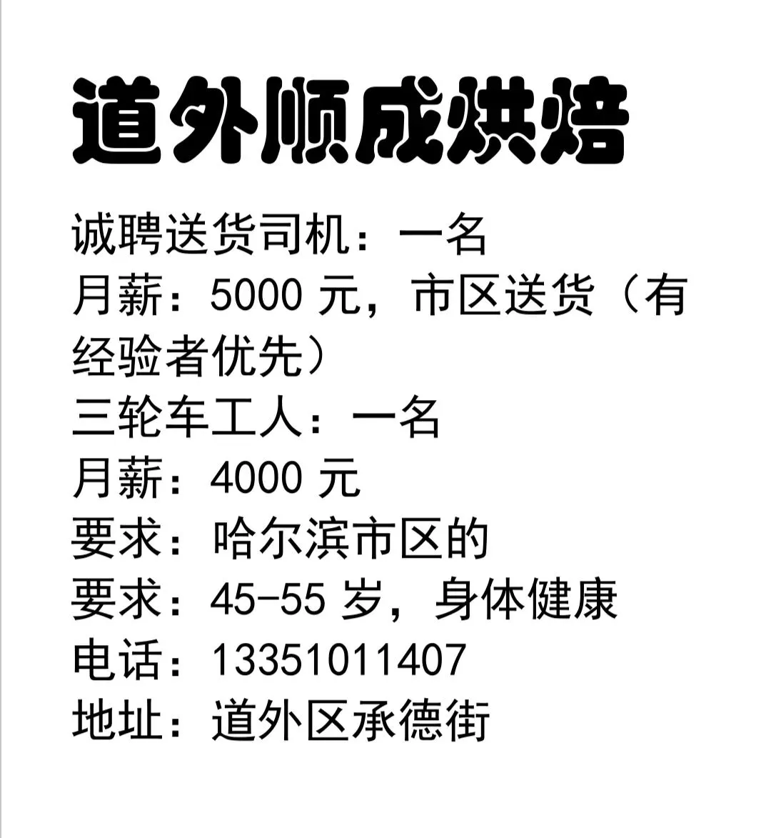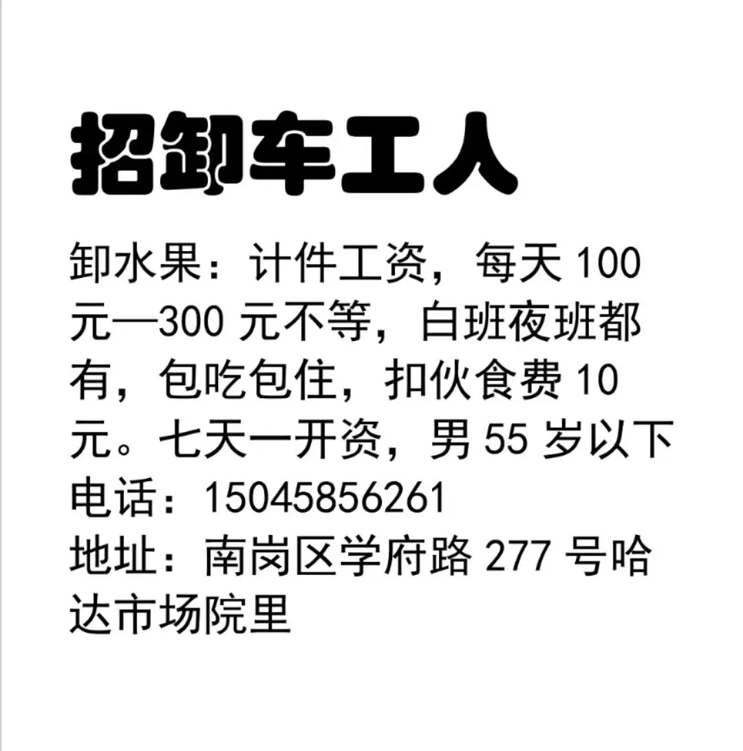 要求:年龄55岁左右,有上岗证,身体好能装卸家住南岗区