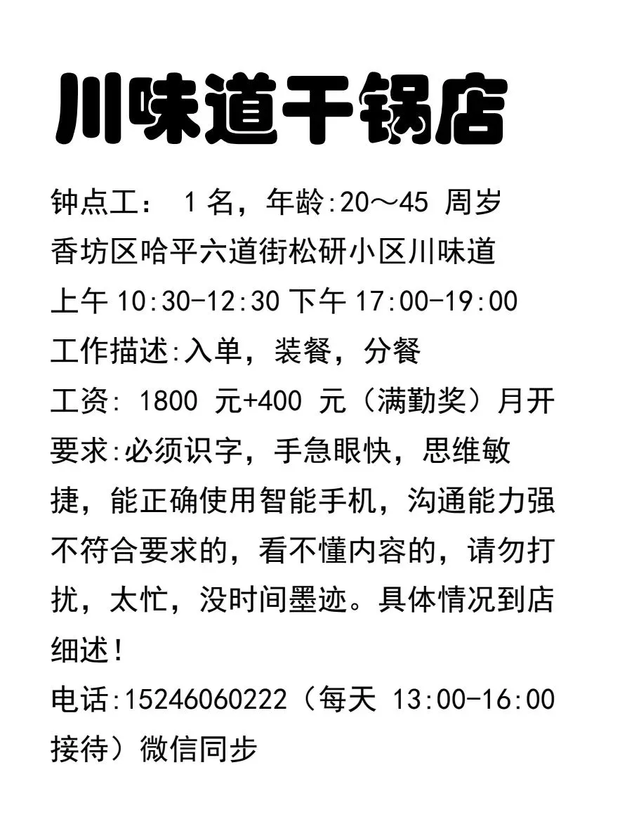 黑龙江龙味央厨食品科技有限公司诚邀精英加盟:加入我们,成就您的梦想!现诚聘车间工人岗位:车间工人:性别不限,采用计件工资制,多劳多得。薪资保底 3600 元/月,计件工资每月可达 3600 - 6000 元,上不封顶。年龄需在 55 周岁以下,身体健康。工作简单易上手,公司免费提供食宿,伙食优质,工作与生活环境良好,还会定期组织团建聚餐。注:周一至周六可前来面试或电话咨询。地址:哈尔滨市香坊区哈成路 261 号 - 8 号咨询热线:19103664999、13796781076微信:19103664999