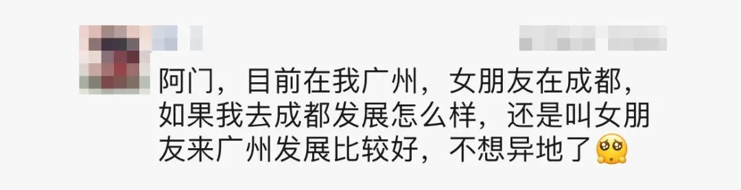 看看你们谁发展得更好了,并不一定是男迁就女,女迁就男,也不一定是哪个城市更大就去哪个,如果2人都是平平,那就选择广州,因为更繁华,更多机会。如果女朋友更出色,那就去成都。