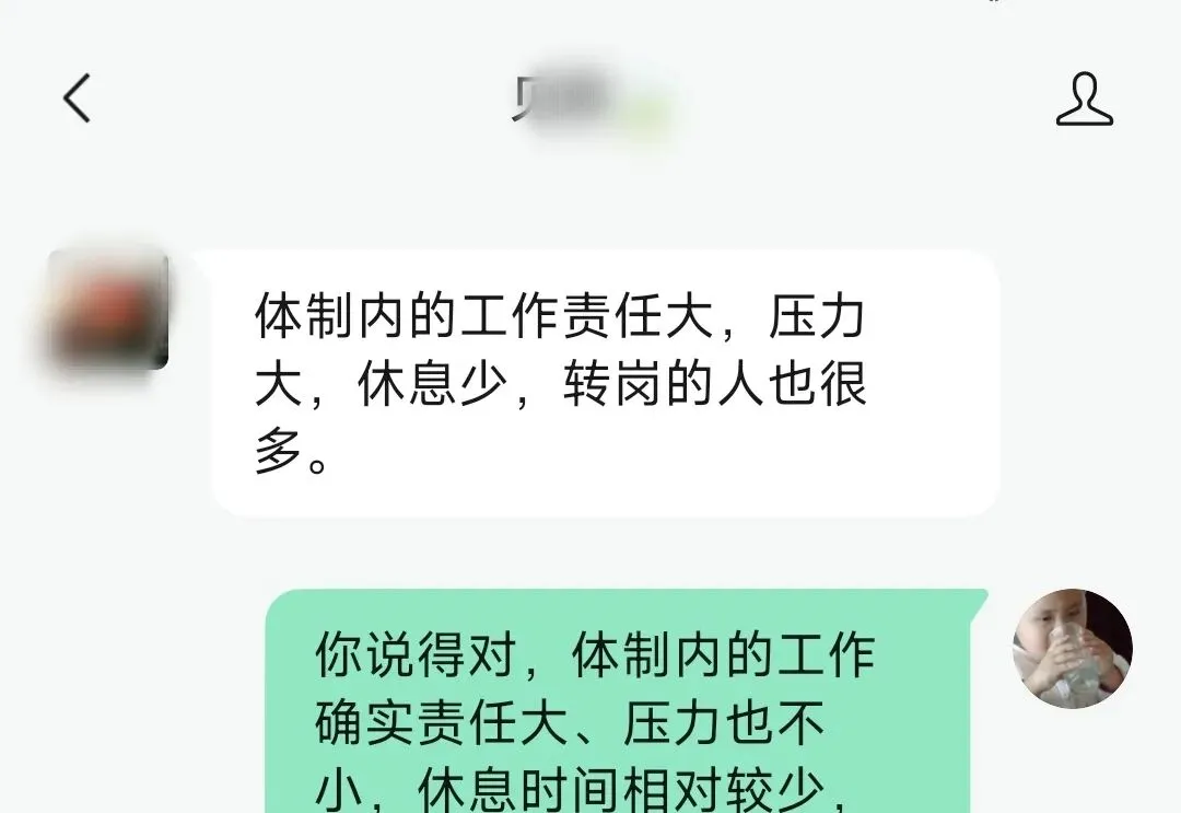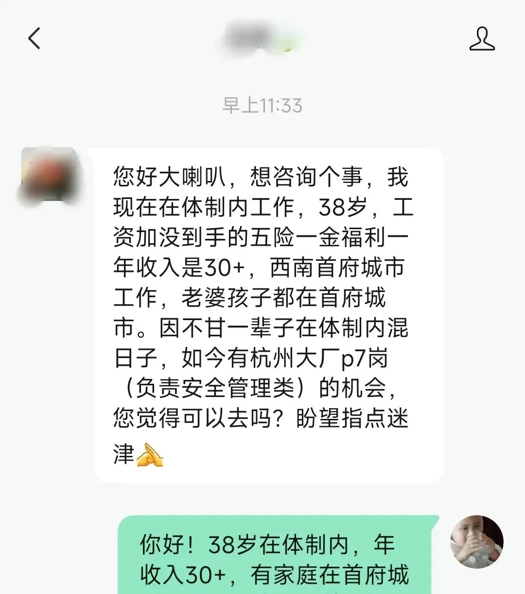 今天后台收到一位读者的留言:他自己在西南某省份省会城市工作,收入30万+,算上五险一金,各种福利等。如今有一份杭州某大厂P7的岗位(负责安全管理类)的机会,纠结要去么?他之所以想要跳槽,一是不想在单位“混”日子;二是工作责任、压力大,休息少,同事转岗的人也不少。由于我看到的有点晚,系统AI智能回答了,比较机械,抓取的观点也是之前发表过的文章。今天这里,大喇叭就根据自己的角度回答一下吧,希望能有帮助。从这位读者应聘的岗位来看,我大概猜到了在体制内是从事什么工作的。身边大学同学和朋友也有做这个的,特别是在基层,压力大、熬夜多......,30多岁的年纪,看起来衰老好多。虽然如此,我还是不建议去。原因有以下几点:首先,38岁对于大厂员工来说,已经处于职业生涯的末期了。这也意味着你即便进去工作了,大概率也待不了几年。那时候年龄过了40岁,正是上有老、下有小的阶段,没有稳定工作,挣钱越来越难,想想都可怕。其次,家庭是否支持异地这也是要重点考虑的。大喇叭身边的朋友、同事有孩子之后,基本上都结束了异地,选择上不是回去老家,就是在工作地贷款买房,北漂的由于落户原因,不少人在天津定居。异地的坏处太多了,这里就不说了。曾经大喇叭我也考虑过异地,媳妇说过这样一句话,从此打消此念头。原话:两口子在一起的日子可能苦一些,但婚姻本就是同甘共苦,一家人在一起才算是过日子。家里的经济状况还没到你非要异地不可,异地不但发不了财,还会让夫妻、孩子之间感情变淡,很容易引发婚姻问题。女人不管是全职带娃,还是在职带娃,男人出去工作,一年见不了几面,那结婚的意义何在。最后,人过35岁+以后,大喇叭我最大的感受,稳定胜过一切。即便在大厂能挣钱,身边很多人贷款买过房车之后,日子过的紧巴巴。好不容易攒够了要还的房贷,却发现自己要离开大厂了。出去找工作,40岁+,好多岗位都嫌年龄大。目前跟大喇叭一样离开大厂的朋友,我知道的,有些创业,企业半死不活,甚至赔钱,不知道能坚持多久;有些经济压力不大,就在家待着,找工作高不成低不就,做点副业看没收益,就不再坚持了;有些去了小厂,薪资减半不说,最终水土不服,一年半载后被裁;比较不错的,就类似大喇叭这样,离开的早,在行情好的时候找到一家国企,算是相对稳定吧。说了这么多,我对此留言读者的建议,总结一句话就是:38岁、异地、跳槽工作不稳定,这些决定着不要选择在职场上“折腾”了,一旦离开原来的那个岗位,再回去是不可能了。当然,这里面也有一种特殊情况除外,原单位实在待不下去了。例如:由于工作原因,导致自己出现了抑郁躯体化反应,到了需要住院治疗的阶段。这已经严重影响到身心健康了,那就离开吧。毕竟,身体没了,剩下的那些都没有任何意义。-- END --