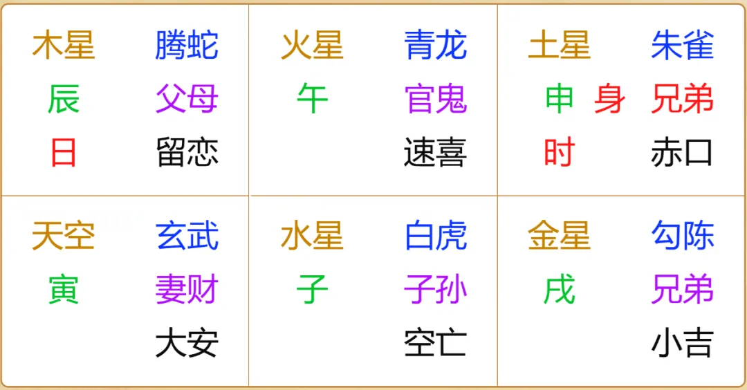 卦主的起卦方式是日时起卦,起卦时间是农历十月二十六下午15点39分,也就是申时。根据江氏小六壬的起卦方式和规则,此卦装完之后如下: