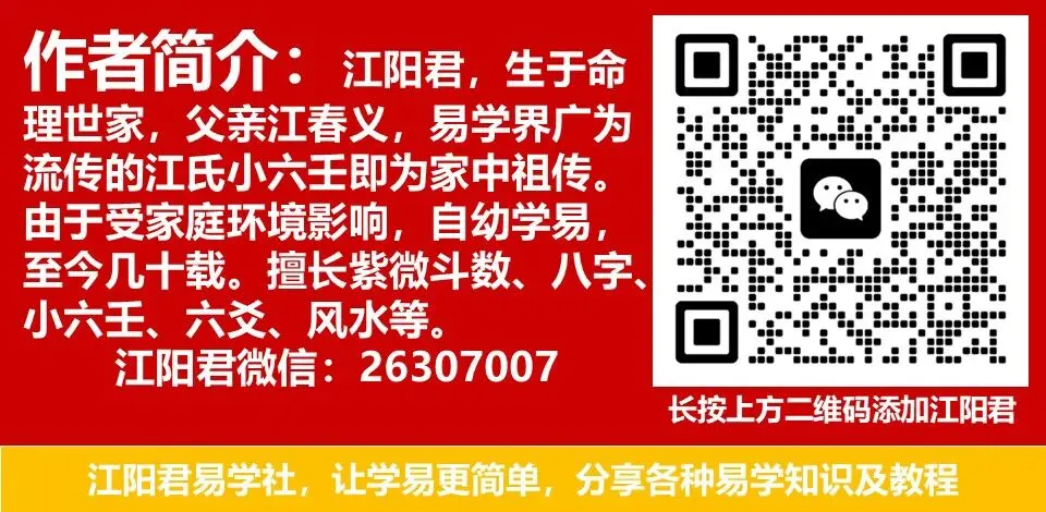 福利:点上方蓝字关注“江阳君易学社”,可免费领取江氏小六壬官方教程、八字教程、紫微斗数快速入门课。有需要者请加微:26307007。