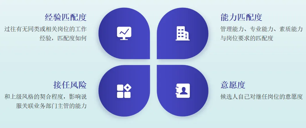 刘成最终继任失败,关键不在于他的业务能力,而是他不能适应上级领导的工作风格,上级也没有给予他充分的包容,这本质上就是一种很难调和的气场不合。对于这种继任风险,HR、业务主管和刘成本人都没有充分评估到,从而导致人才流失的损失。我在另外一篇关于招聘的文章里也讲过,候选人能否胜任和留存的一个很重要的因素就是与上级、团队的“风格匹配”,光有专业能力不行。因此,在关于继任者评估实践中,我也提出包括接任风险和个人意愿度在内的四个评估维度,缺一不可:
