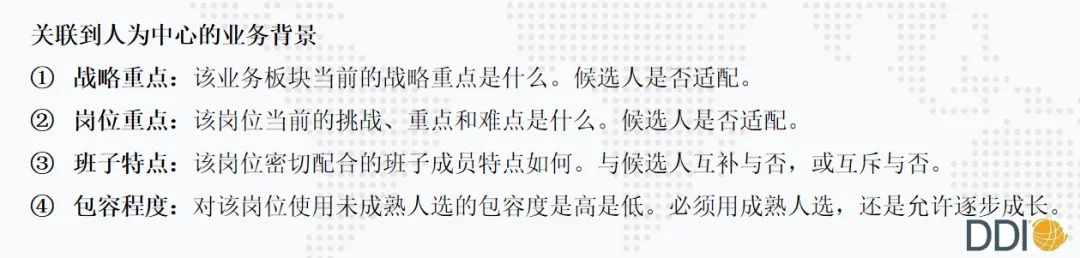 这个模型和DDI在人才盘点中的一个方法论有不谋而合之处,尤其在考虑人与“班子特点”、“包容程度”方面,实际也是一种“接任风险”评估。DDI强调在人才盘点中关联到人才个体时,我们要多问几个问题,这几个问题即可用来评估人才与现任岗位的“人岗匹配度”,也可以看人才与后备梯队的“人岗匹配度”。