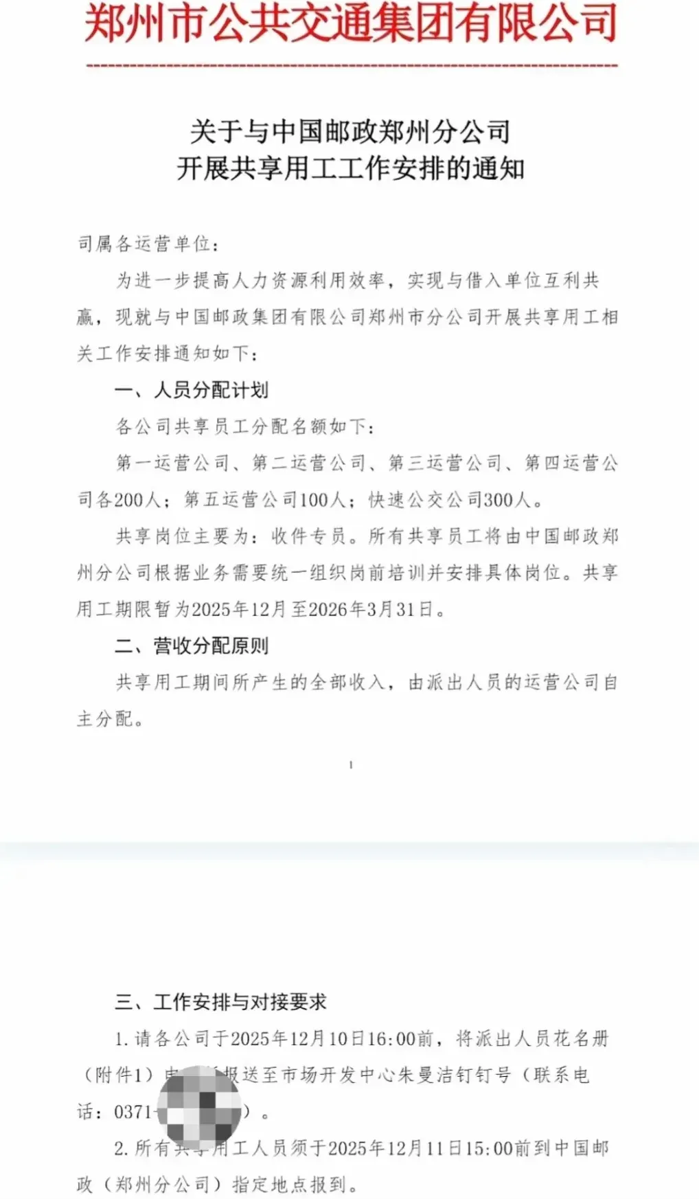 近期郑州市公共交通集团的一则通知引发热议:该集团计划抽调 1200 名员工,以 “共享用工” 形式支援中国邮政郑州分公司的收件工作,期限从 2025 年12月持续到2026 年3月,共享期间收入由原公交运营公司自主分配。