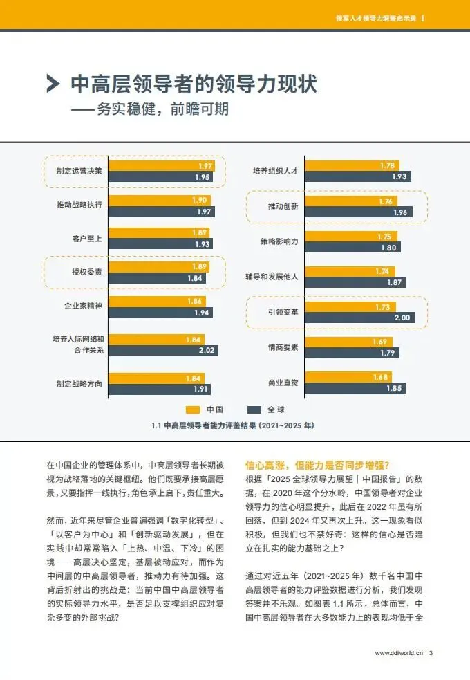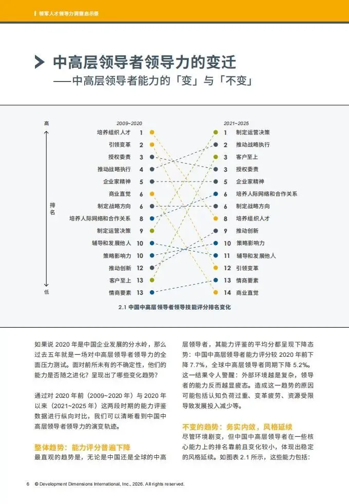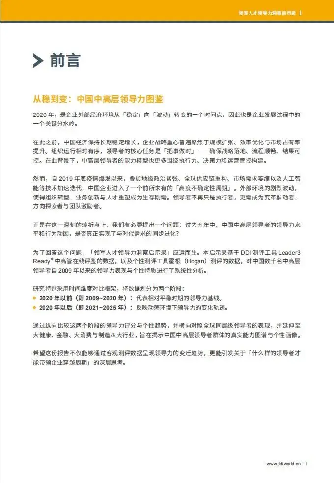 《领军人才领导力洞察启示录》基于DDI测评工具与霍根个性测评数据,对中国数千名中高层领导者2009年以来的表现进行系统性分析,以2020年为时间分水岭,对比了平稳时期与动荡环境下的领导力变迁,同时涵盖四大行业的特色洞察。