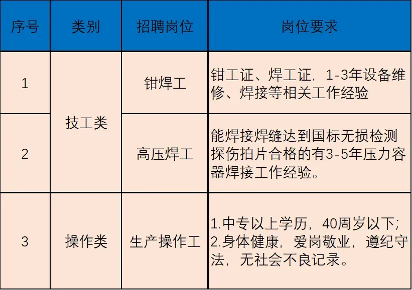 2.薪资水平:高压焊工、硕士及以上学历薪资面议;专业类:5000元/月-8000元/月;技工类:5500元/月-7500元/月;操作类、后勤类:5000元/月-7000元/月。