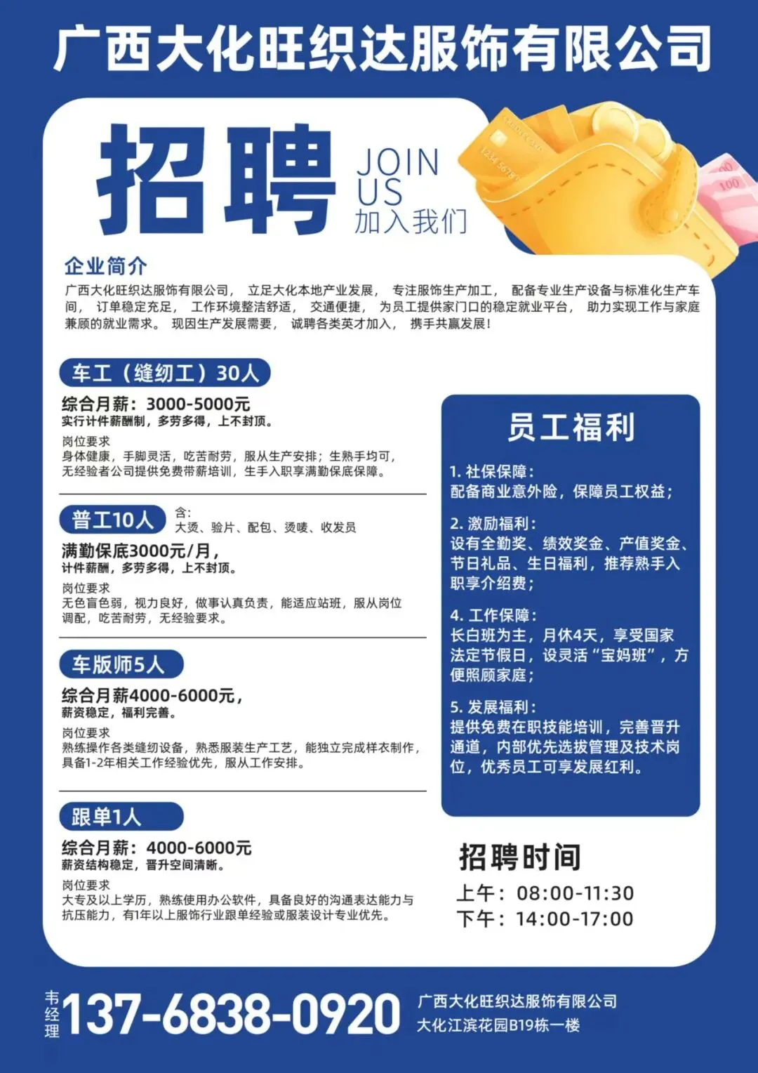 要求:限女性,月休3天,年龄20-48岁,无需经验