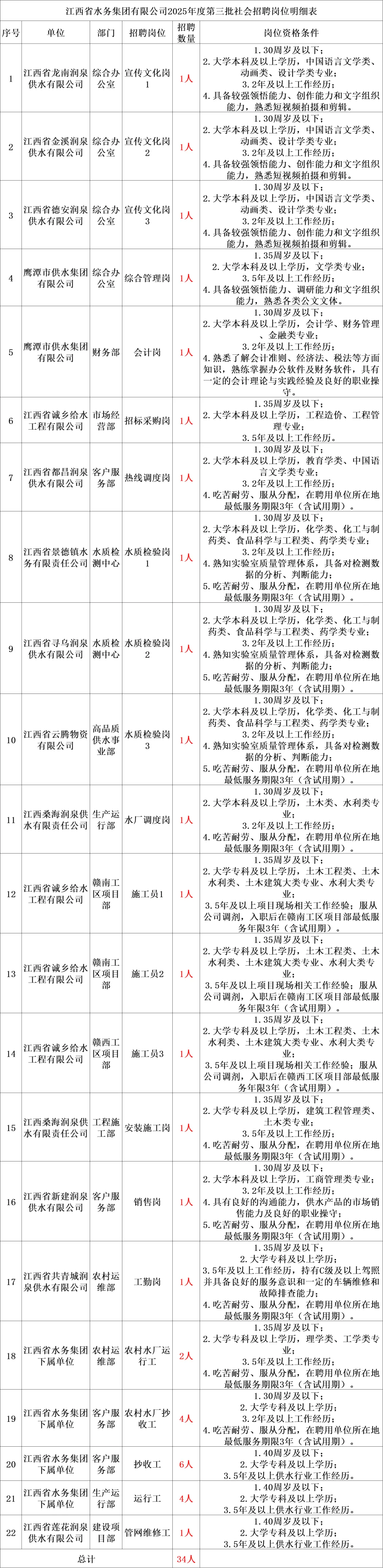 江西省水务集团有限公司成立于2010年7月19日,系省属重点国有企业江西省水利投资集团有限公司全资子公司,主要负责全省城乡供水项目的投资、建设、运营等相关业务,拥有涵盖城乡供水、规划设计、检测研发、投资建设和运营管理、智慧水务的完整产业链。截至2024年底,所属全资及控股(参股)子公司54家,下辖自来水厂220座,日供水设计规模超600万吨,服务区域覆盖总人口近2000万。江西水务在夯实供水主业的基础上,不断探索产业链延伸发展变革,形成了高品质供水、农村物业化服务、智慧水务发展的新路径,力争打造成为国内领先的现代化综合性水务投资运营服务商。本批次招聘计划为22个岗位,共34人。具体岗位需求人数详见附件《江西省水务集团有限公司2025年第三批社会招聘岗位明细表》。1.思想品德端正,遵纪守法,诚实守信,身体健康。具备良好的职业素养、团队意识和较强的事业心、责任心。无刑事犯罪和严重违反法规等不良记录。3.具备胜任岗位的专业理论功底,有较强的工作能力、专业素质和综合素质。4.具备招聘岗位所要求的资格条件(详见附件《江西省水务集团有限公司2025年第三批社会招聘岗位明细表》)。资格条件说明如下:(1)本次招聘要求的年龄、学历、工作经历等的计算截止时间为2025年11月30日。(2)对工作经历的认定,以签订的劳动(聘用)合同、养老保险缴费证明(需当地社保部门盖章)等为准,其中简历筛查阶段暂以应聘人员填报的工作履历信息为准,确定复试名单前再次对相关材料进行资格复查。应届毕业生在校期间参加社会实践、实习、兼职等经历,不论是否与单位签订劳动合同、缴纳社会保险,均不视为工作经历。网上报名→资格审查→现场测试→体检、背景调查→公示录用。资格审查贯穿招聘工作全过程,任何环节发现应聘人员不符合岗位报名条件或提供虚假材料(如填写的简历信息不实或存在欺骗、隐瞒亲属关系的情况等),一经查实,取消应聘人员测试或录用资格。管理岗、技术岗确认参加笔试的人数与岗位招聘数量比例不足3:1的,取消或核减该岗位招聘计划;生产服务一线岗确认参加初试的人数与岗位招聘数量比例不足3:1的,取消或核减该岗位招聘计划。1.管理岗、技术岗采取笔试和面试相结合方式进行。按照笔试成绩从高分到低分的顺序,每个岗位均按1:6比例确定入围面试人员,当末位成绩并列时,并列人员一同进入面试。参加笔试人员不足1:6的全部进入面试。笔试有缺考、作弊、成绩为0分等情形的,不得进入面试环节。2.生产服务一线岗初试、复试均采取面试形式。按照初试成绩从高分到低分的顺序,每个岗位均按1:3比例确定入围复试人员,当末位成绩并列时,并列人员一同进入复试。满足开考条件且实际参加初试人员不高于1:3的,该岗位不设置复试,以初试成绩为最终成绩。