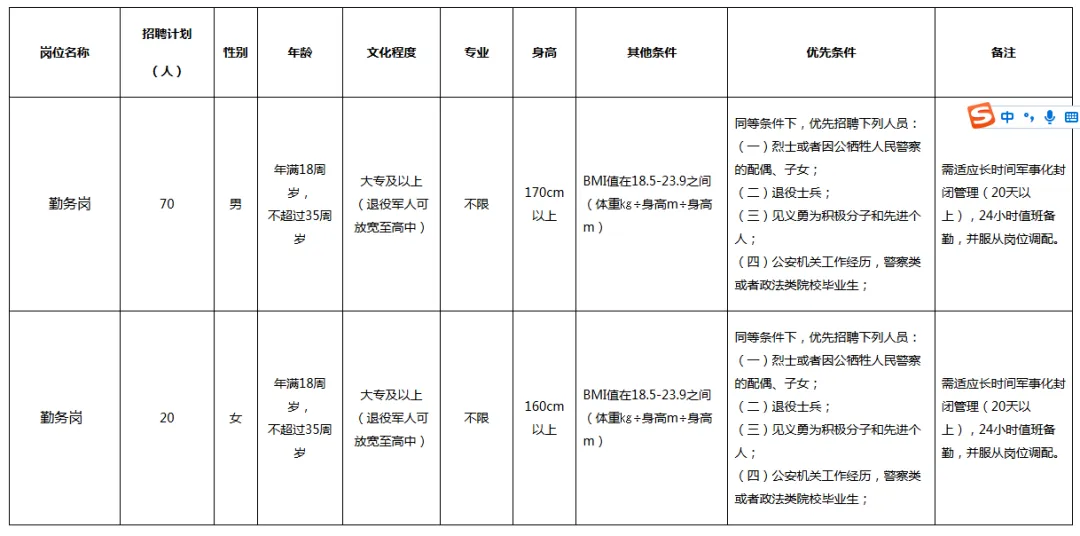 1.具有中华人民共和国国籍;2.拥护中国共产党的领导和中华人民共和国宪法,遵守法律、法规,品行端正;3.年满18周岁、不超过35周岁;4.具有大专及以上文化程度(退役军人可放宽至高中);5.具有能正常履行岗位职责的身体条件、心理素质和工作能力,具有良好的政治素质和道德品行;6.能适应留置看护、值班等勤务要求,服从单位安排的任务,服从单位岗位调整安排; 7.男性身高不低于1.70米;女性身高不低于1.60米。