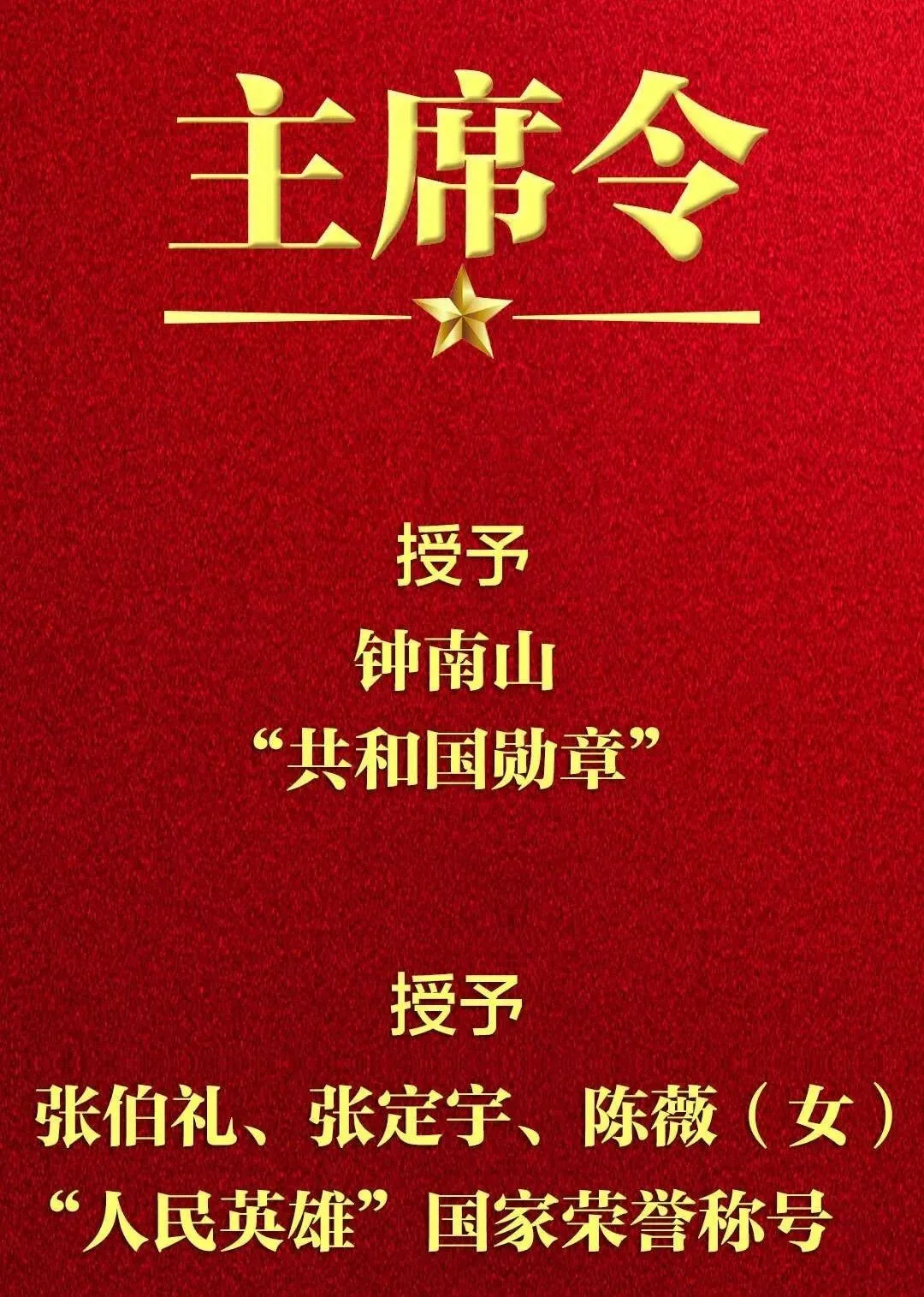 国家主席习近平11日签署主席令,根据十三届全国人大常委会第二十一次会议11日下午表决通过的全国人大常委会关于授予在抗击新冠肺炎疫情斗争中作出杰出贡献的人士国家勋章和国家荣誉称号的决定,授予钟南山“共和国勋章”,授予张伯礼、张定宇、陈薇(女)“人民英雄”国家荣誉称号。