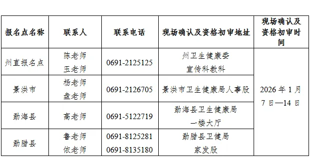 本次考试西双版纳考点分设州直、景洪市、勐海县、勐腊县4个报名点。其中,州直医疗卫生单位、景洪市第一人民医院到州卫生健康委宣传科教科(州直报名点)报名确认;各县(市)卫健局负责辖区内医疗卫生单位(含民营医疗机构)及计生服务机构的考生报名及现场确认工作。各报名点于2026年1月14日前完成考生报名信息确认、资格初审和系统提交工作,逾期不再接收报名材料,后果自负。