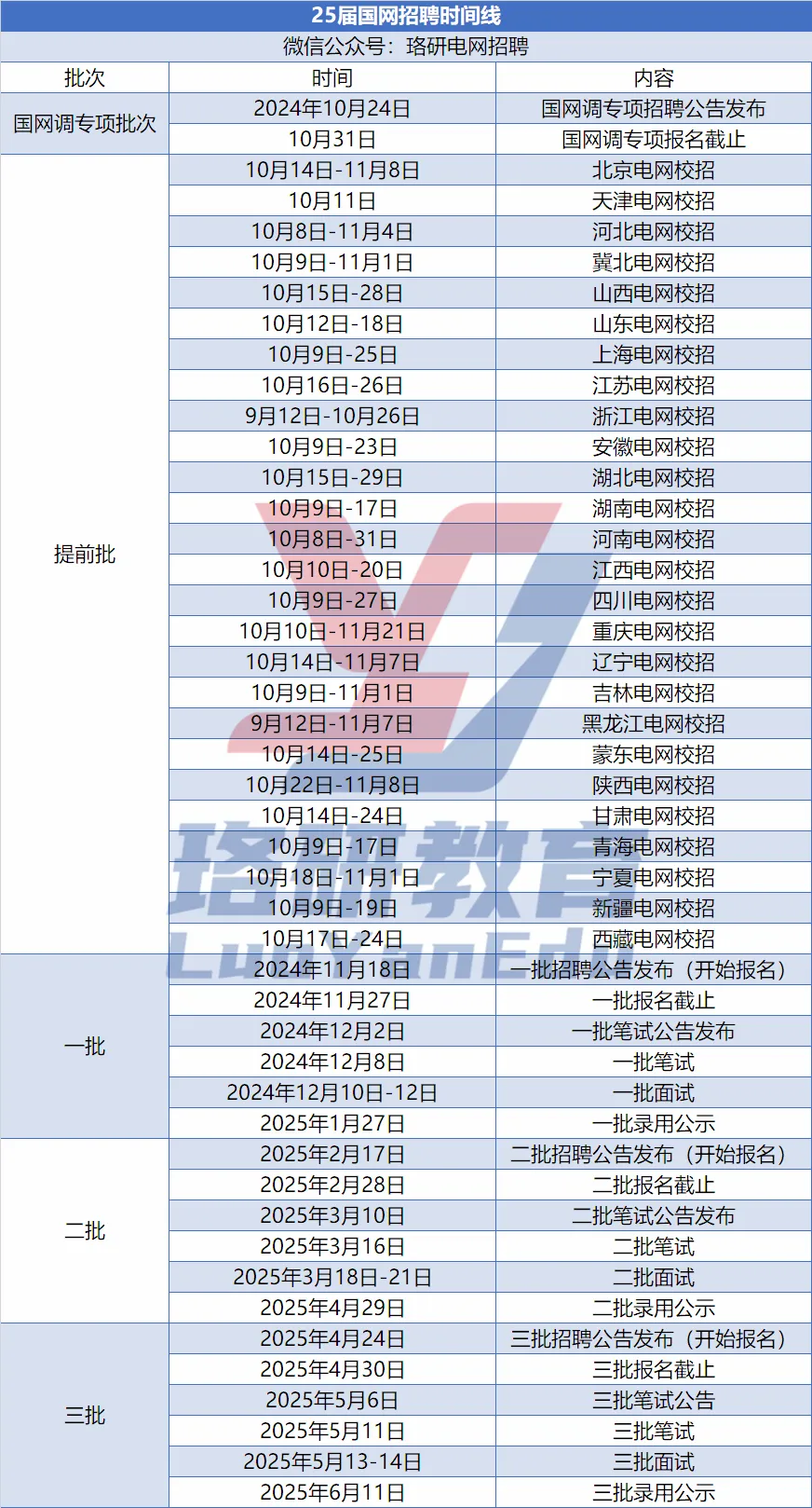 珞研电气哥将25届国网招聘时间线汇总为一张表,方便大家可以保存查看: