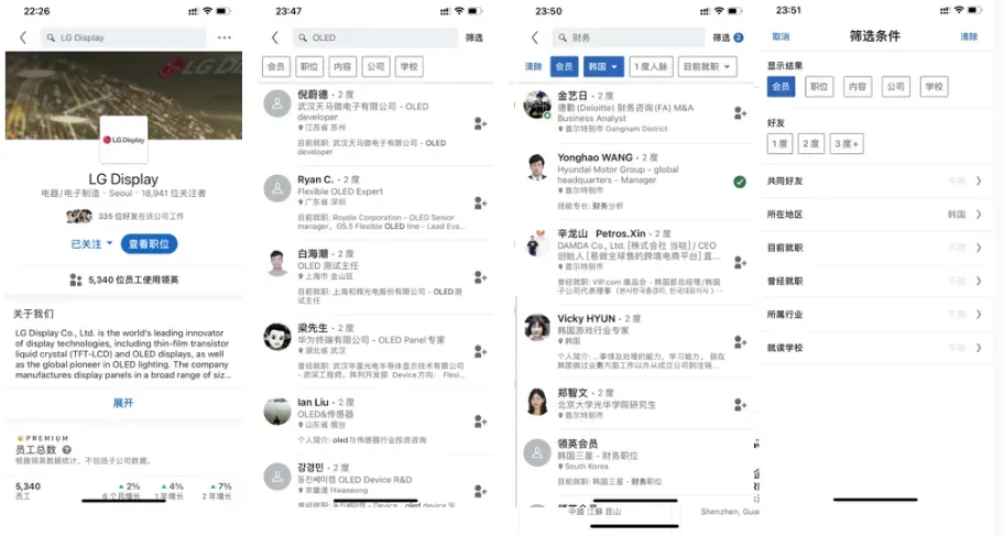 关键词检索是猎头寻访候选阶段最常用的手段,领英作为用户众多的职场交流平台,对用户的身份做了详细的细分,比如候选的所在区域,语言程度,候选工作经历,所在公司。这些内容都可以被检索到