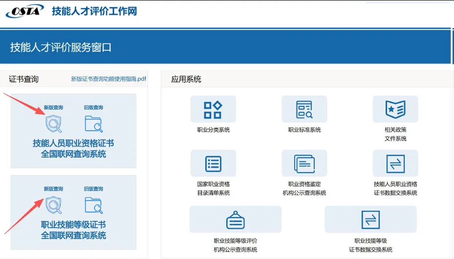 技能人才评价工作网(http://osta.mohrss.gov.cn)首页 “证书查询” 模块。